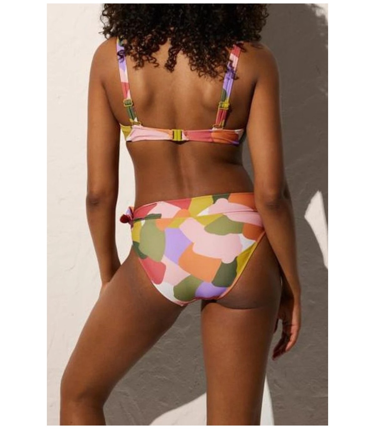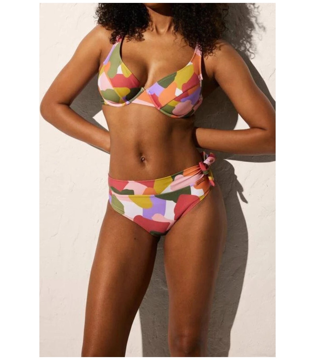 Presenta un estampado multicolor vibrante, un sujetador con aro y tirantes regulables, y una braga midi que garantiza comodidad y soporte.