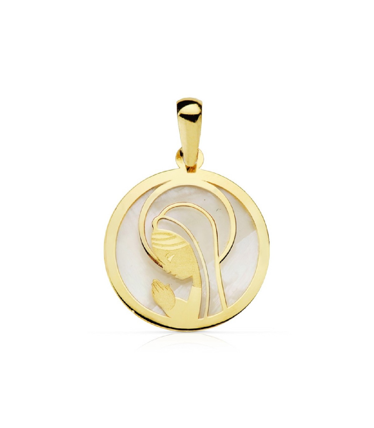 Medalla para niña. Fabricada en oro amarillo de 18 quilates. Acabado brillo. Reverso de la medalla en oro. Piedra nácar. Asa con forma triangular. Tamaño 17 mm. Certificado de calidad y de garantía. Se presenta en estuche y bolsa.