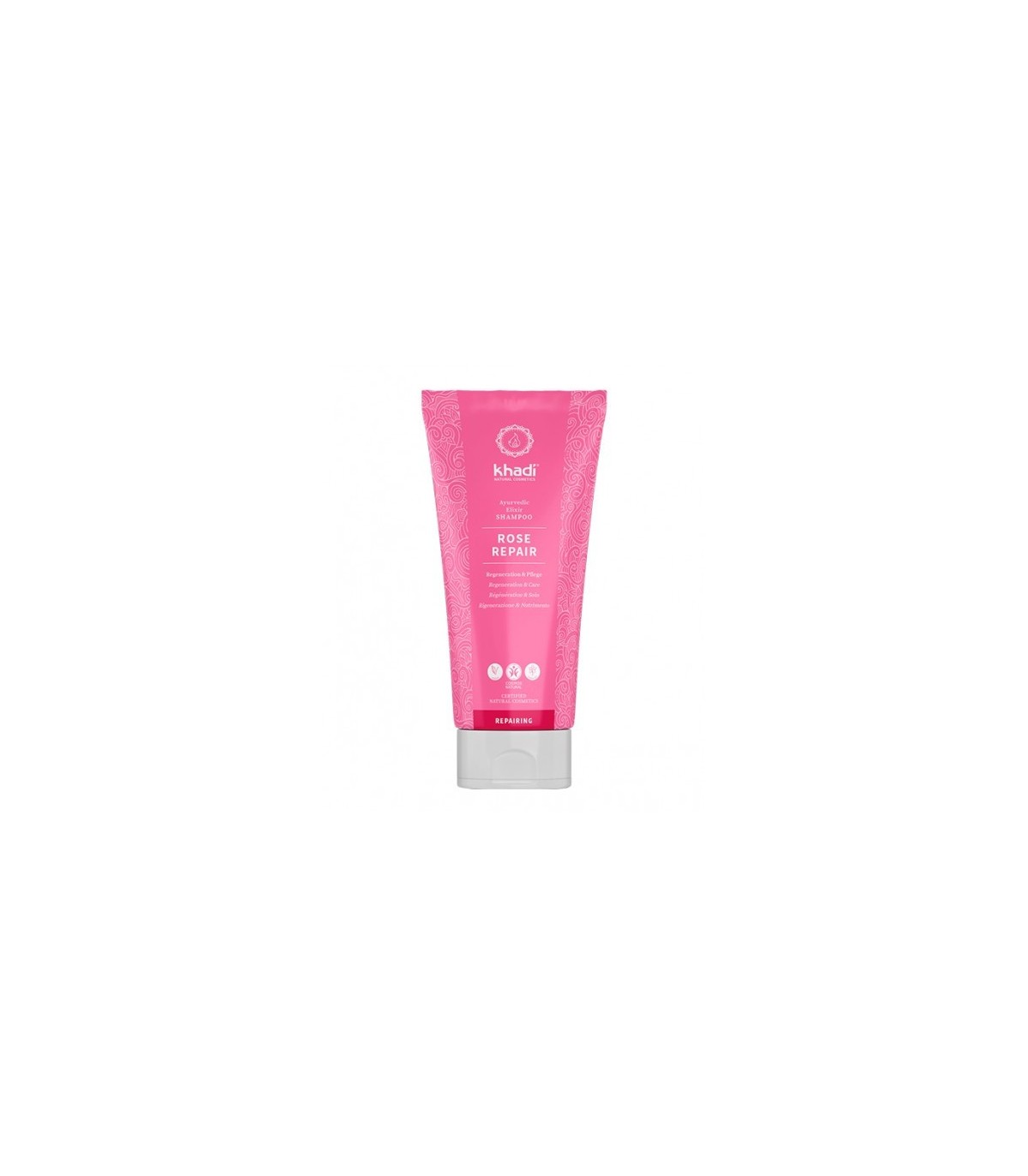 Champú Rosas Reparador de Khadi, elixir ayurveda para fortalecer y proporcionar suavidad y brillo al cabello dañado con aroma a flores.