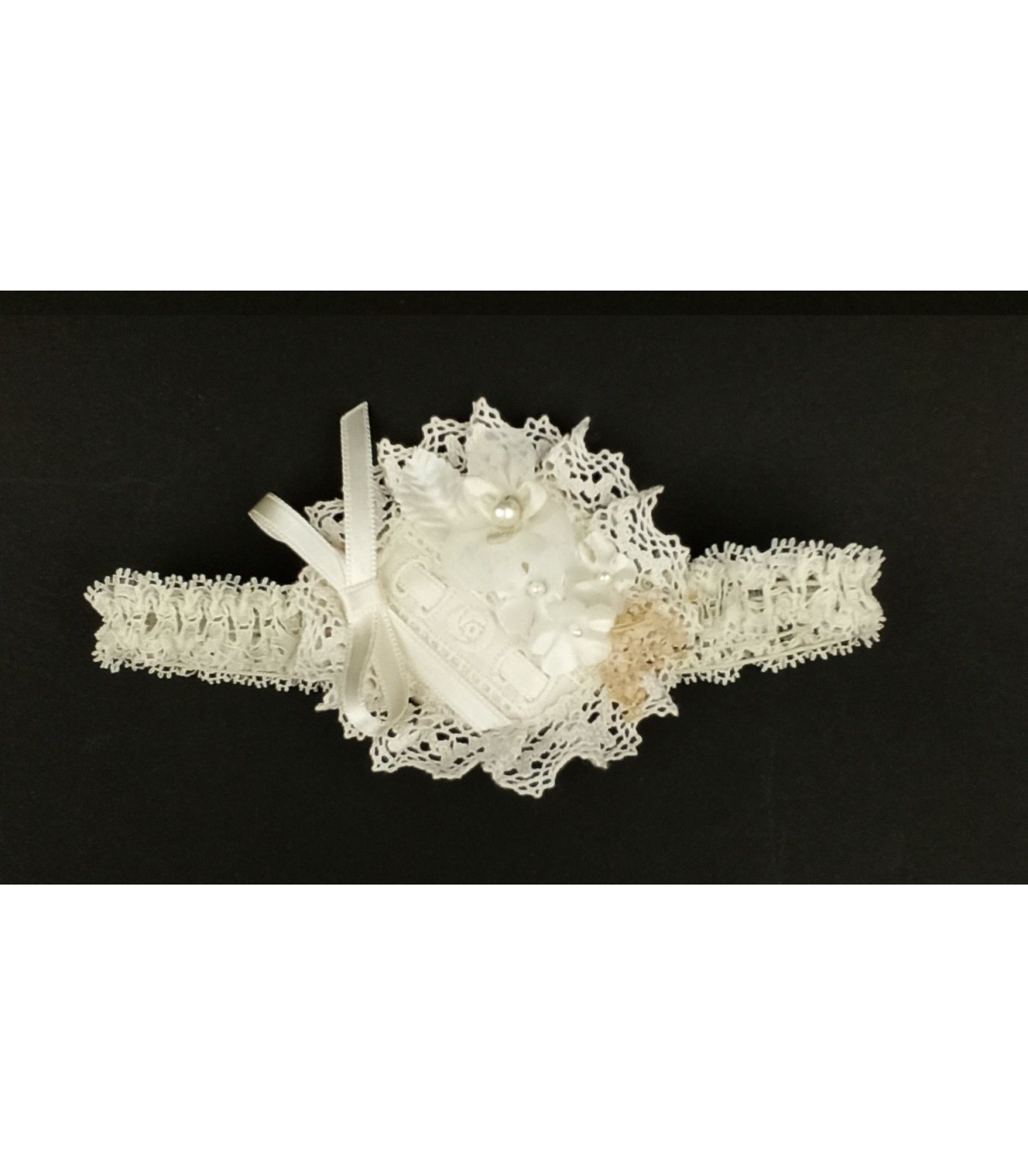 Elástico color marfil adornado con un bonito tocado con tira bordada y flores celestes y azul marino