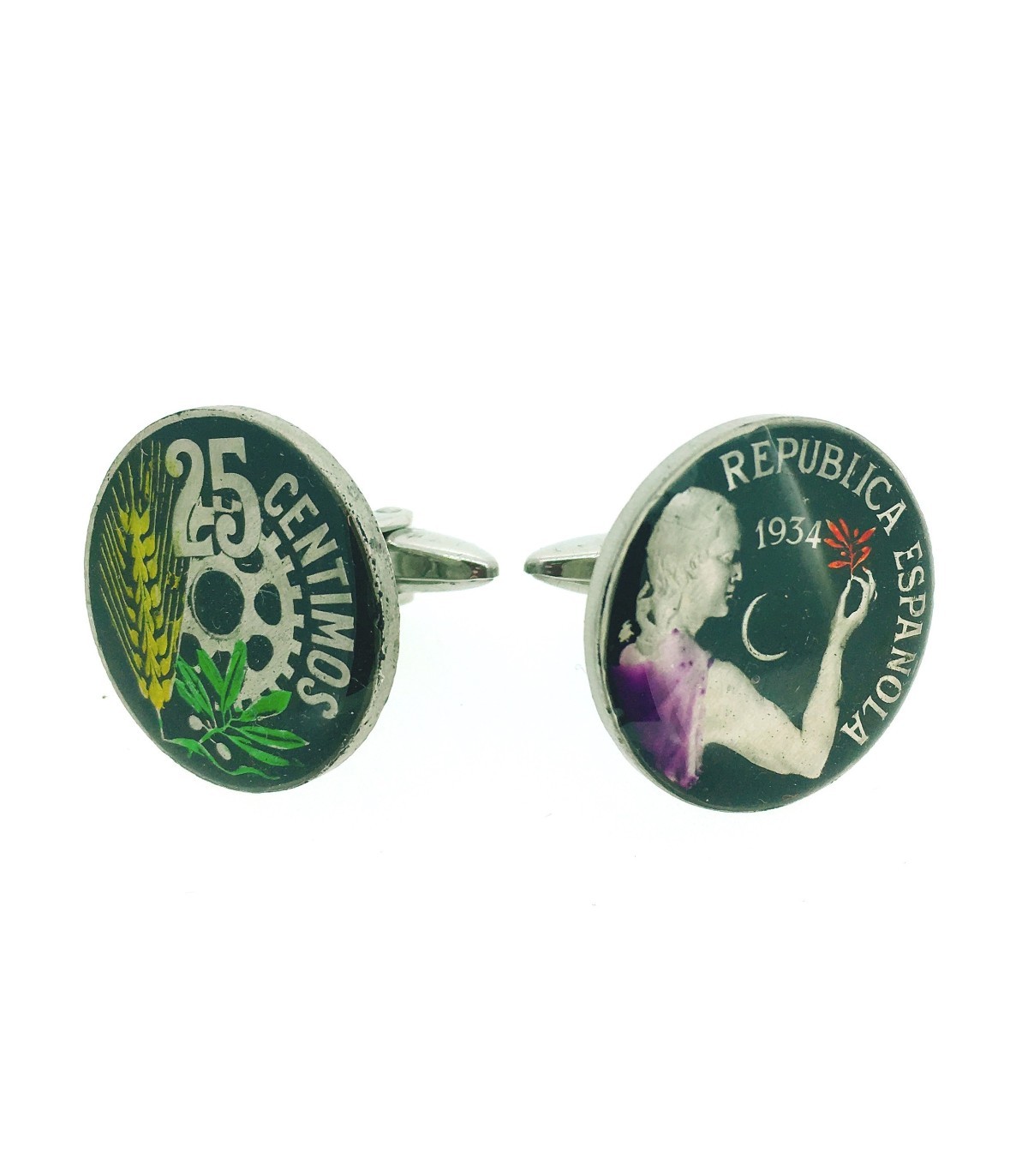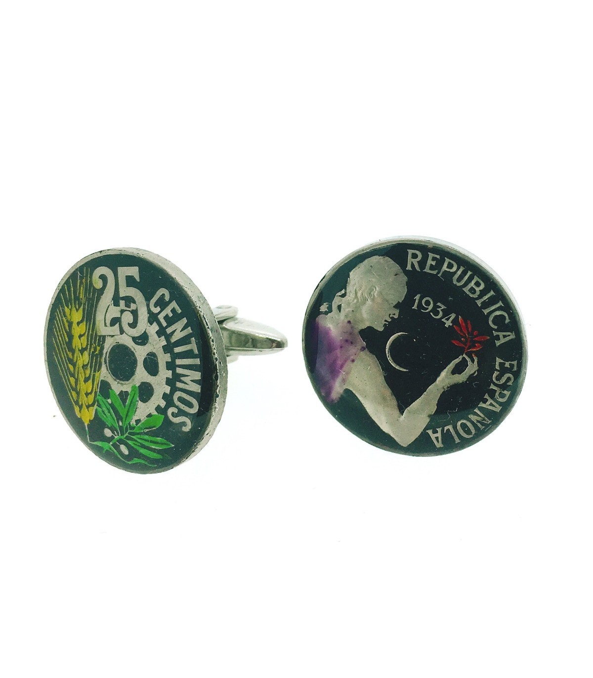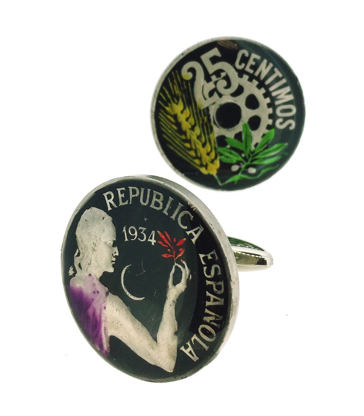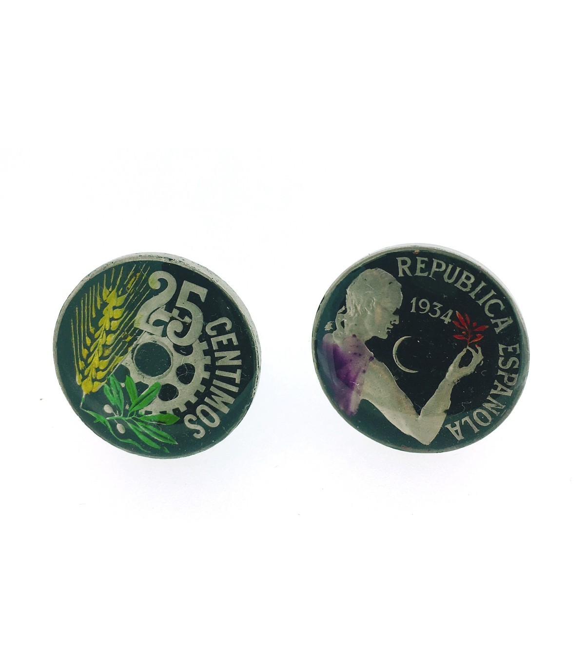 <p>Gemelos de Camisa realizados a partir de una moneda de la segunda republica española de 25 ctmos, se le ha pintado a mano y se le ha aplicado gota de resina para darle consitencia haciendo de estos gemelos una joya unica y exclusiva.</p>