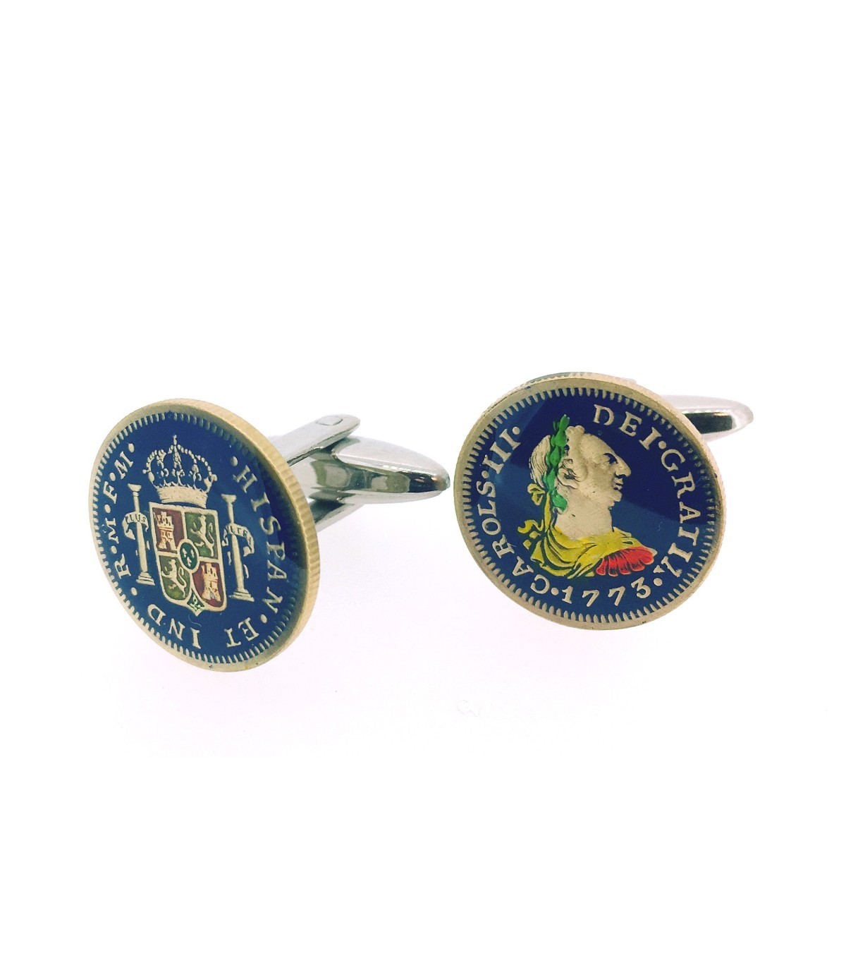 <p style= text-align: justify; ><strong></strong>Gemelos de camisa que se han creado a partir de un par de monedas replicas exactas de las originales de un real de Carlos III a las que se les ha dado color con esmaltes especiales y se han cubierto con