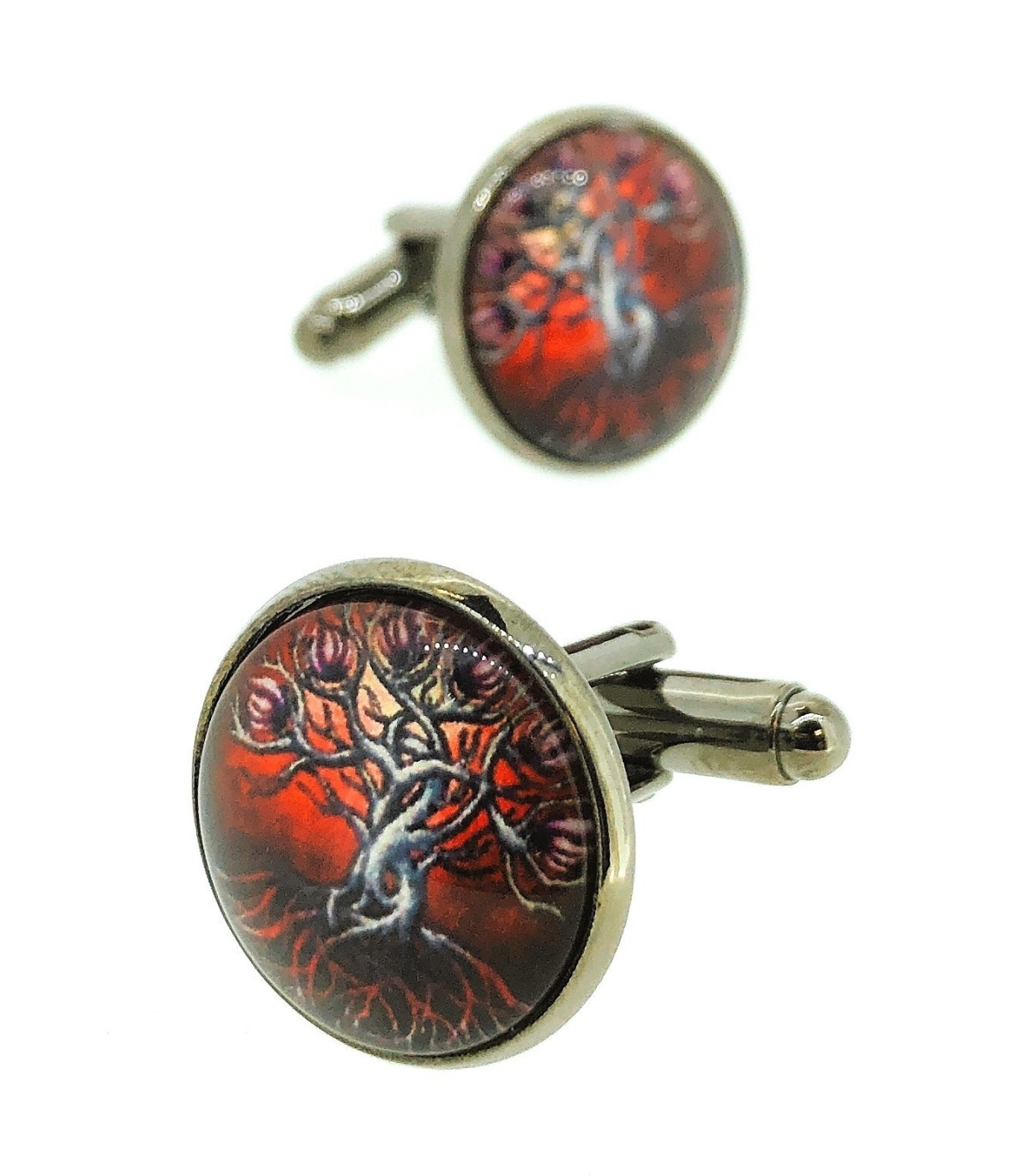 <p>Gemelos de camisa realizados en latón que representan a un árbol negro sobre un fondo rojo.</p>