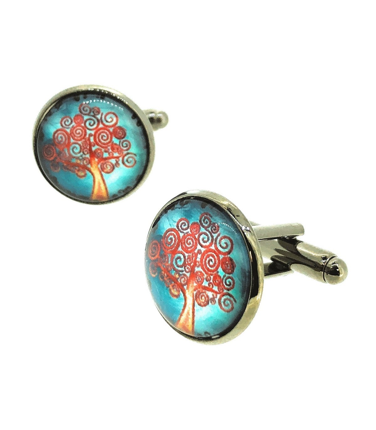 <p>Gemelos de camisa realizados en latón que representan a un árbol rojo sobre un fondo azul.</p>