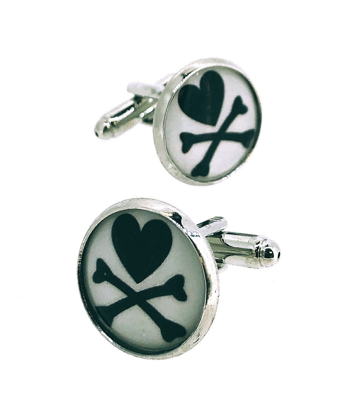 <p>Gemelos para Camisa que lleva la imagen de un corazón y unos huesos cruzados en color blanco y negro.</p>