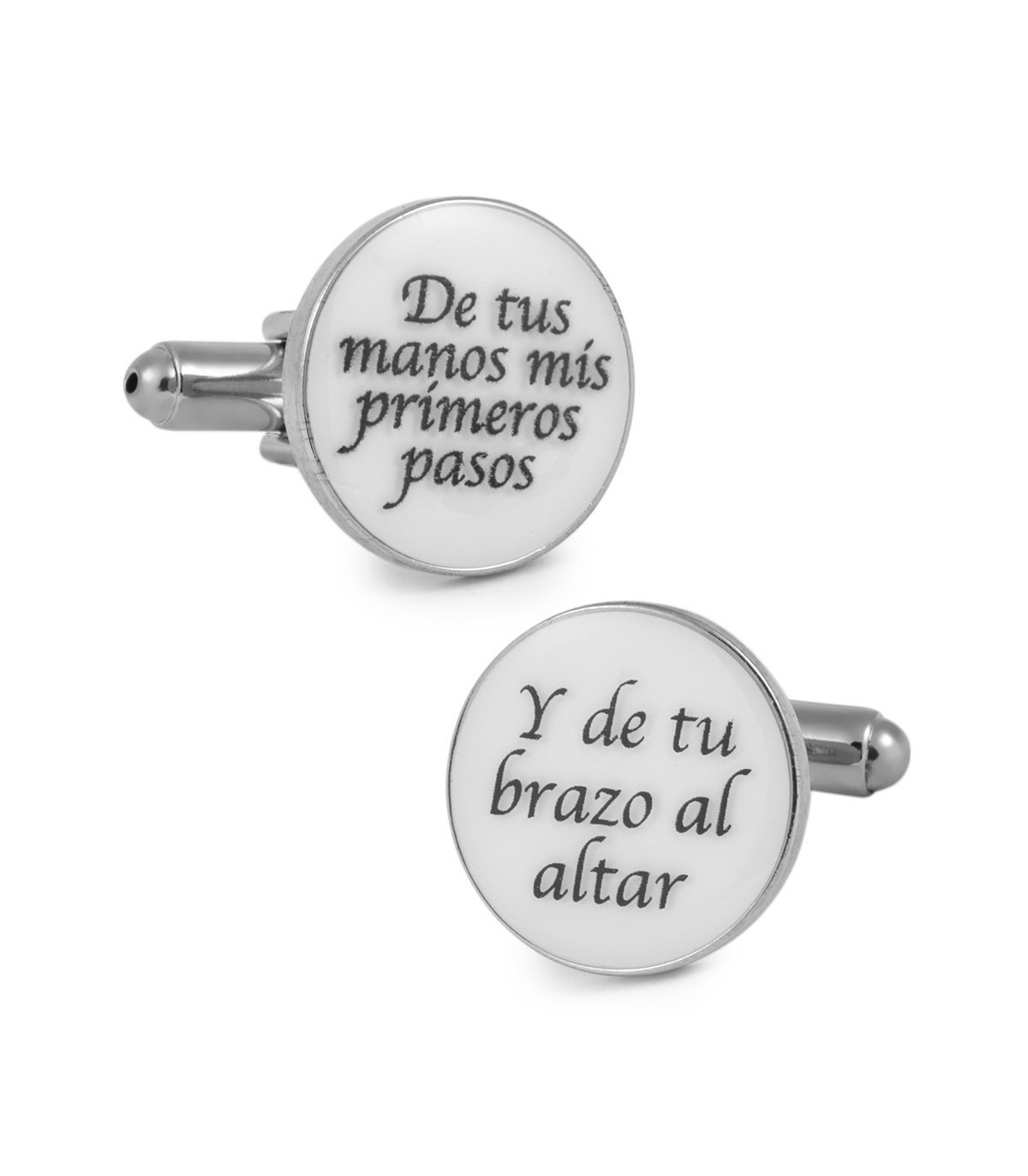 <p>Gemelos para Camisa que llevan una frase muy bonita: De tu mano mis primeros pasos y de tu brazo al altar</p>