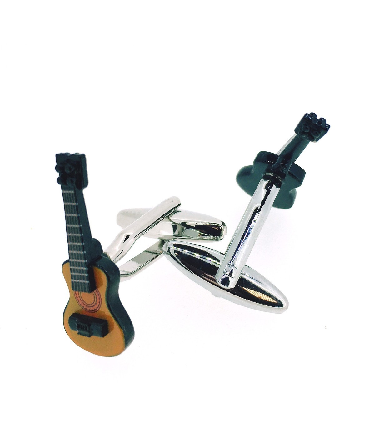 <p><strong></strong>Gemelos de camisa que representan una guitarra española en tres dimensiones en colores marrones y negros.</p>