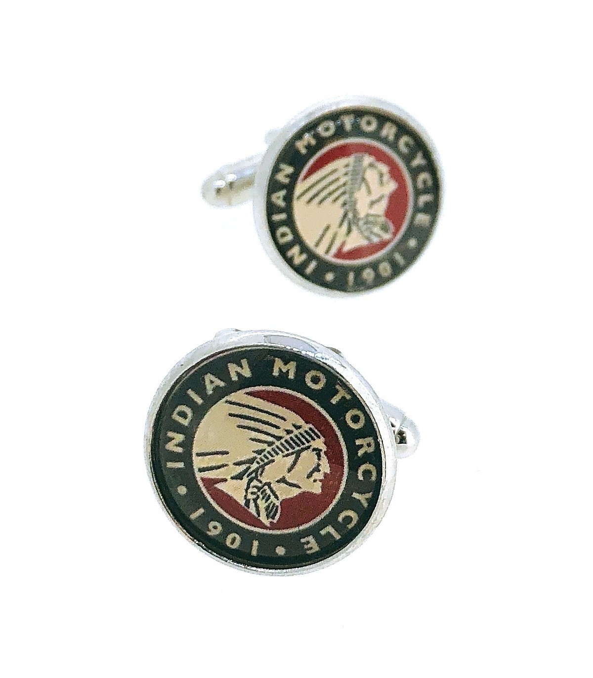 <p>Gemelos para Camisa que lleva la imagen de la marca estadounidense de motos Indian Motorcycle en color negro, rojo y blanco.</p>