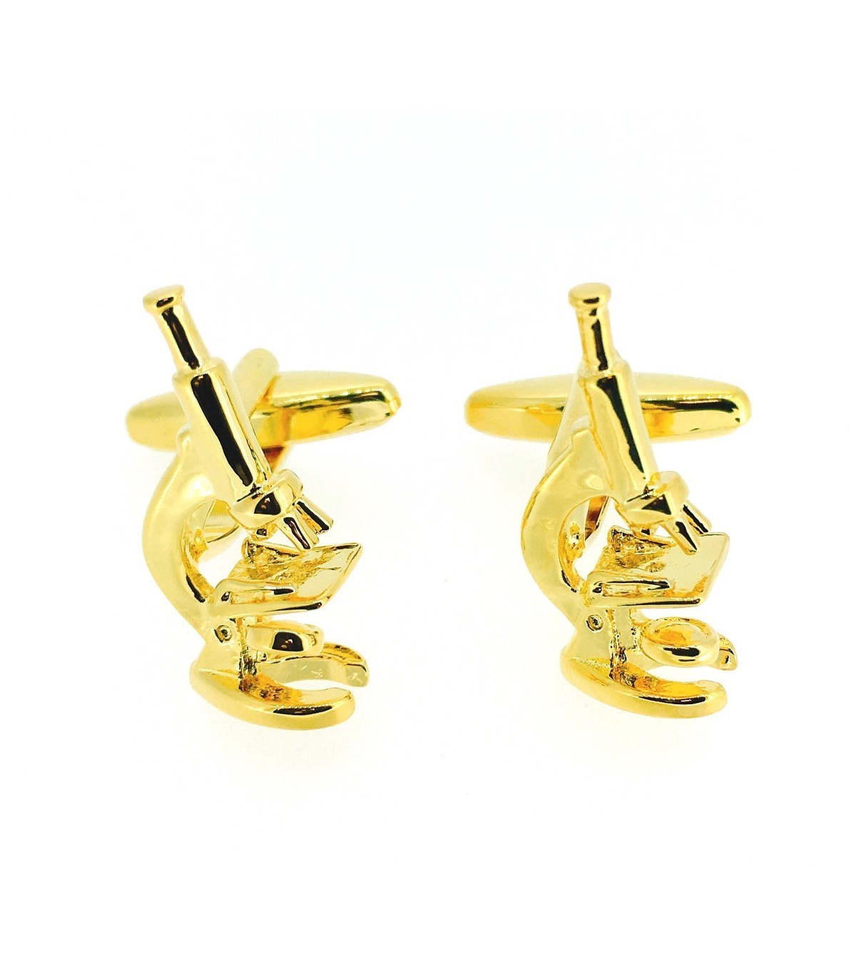 <p style= text-align: justify; ><strong></strong>Gemelos de camisa fabricados en laton reluciente en tonos dorados que representa un microscopio en tres dimensiones.</p>