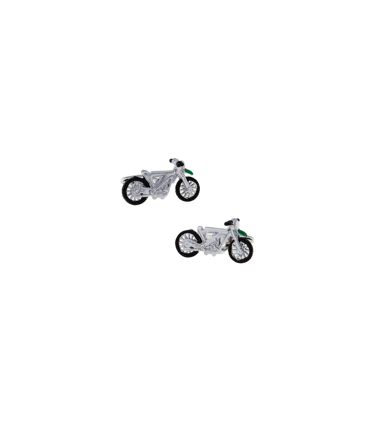 <p>Gemelolandia presenta estos gemelos que representan una moto de cross en color plateado con las ruedas en color negro y el guardabarros delantero en color verde.</p>