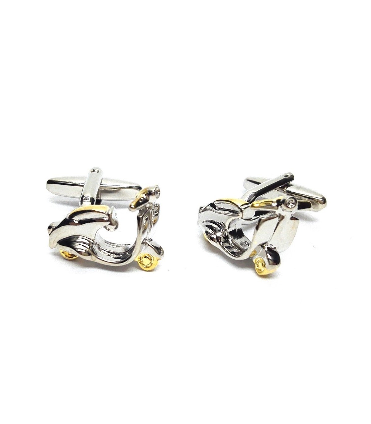 <p><strong>Gemelos de camisa</strong> que representan una scooter tipo lambretta en tonos dorado y plateado</p>