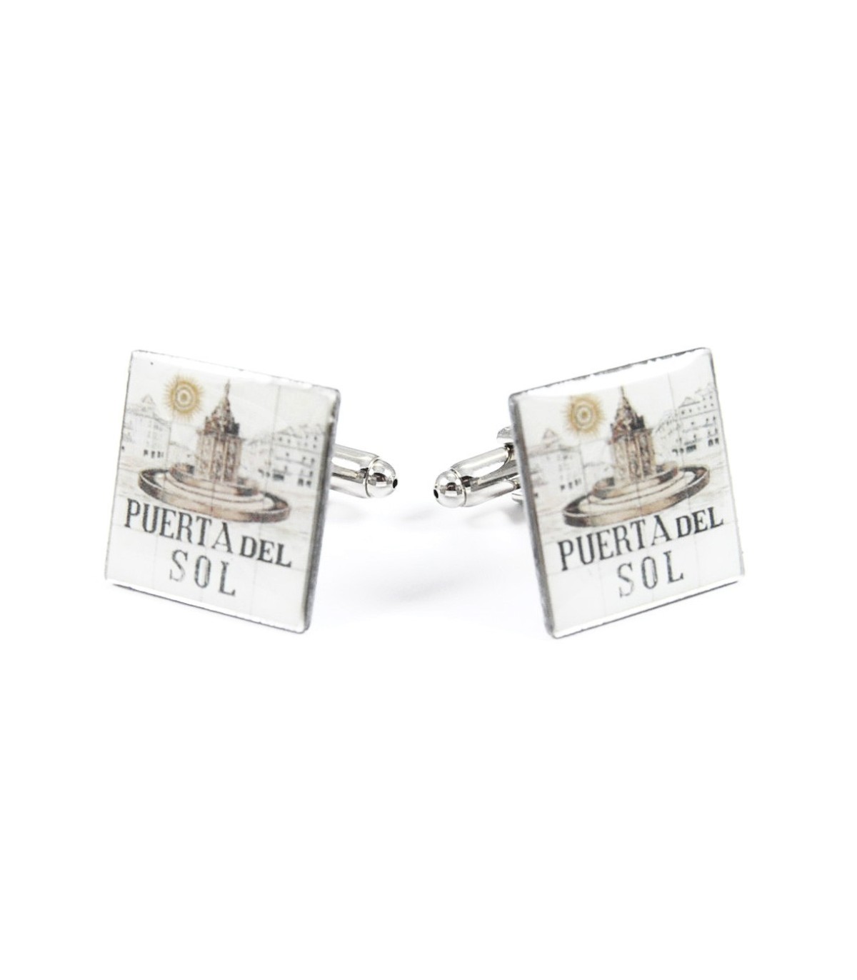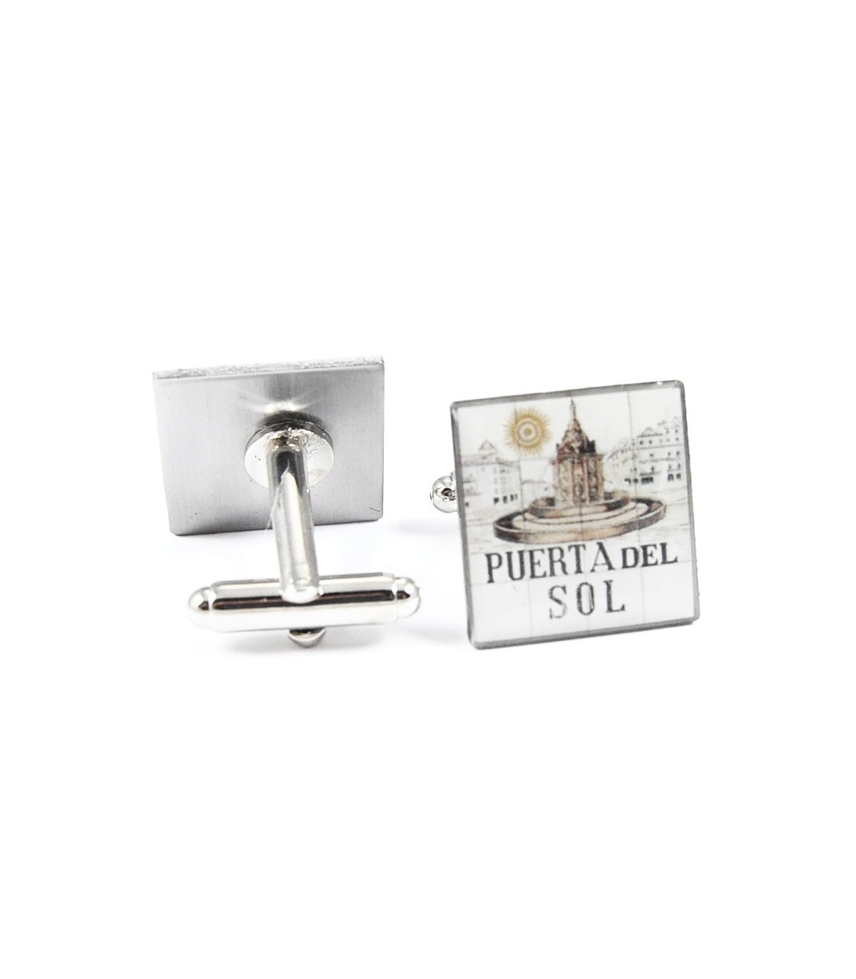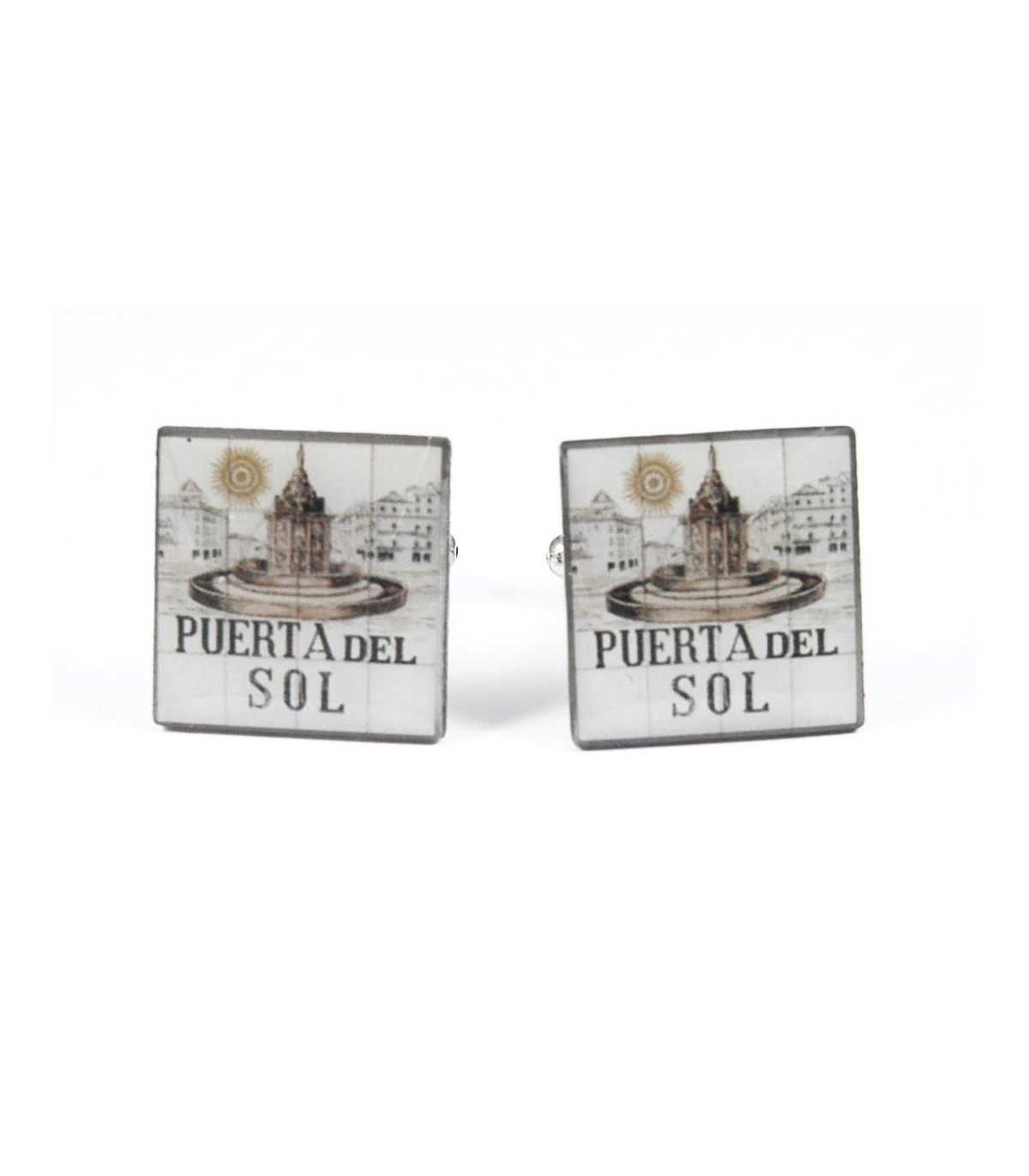 <p style= text-align: justify; >Gemelos Puerta del Sol de Madrid. Acero Rodiado, Esmaltado y con baño antialérgico, tamaño de 19 mm</p>