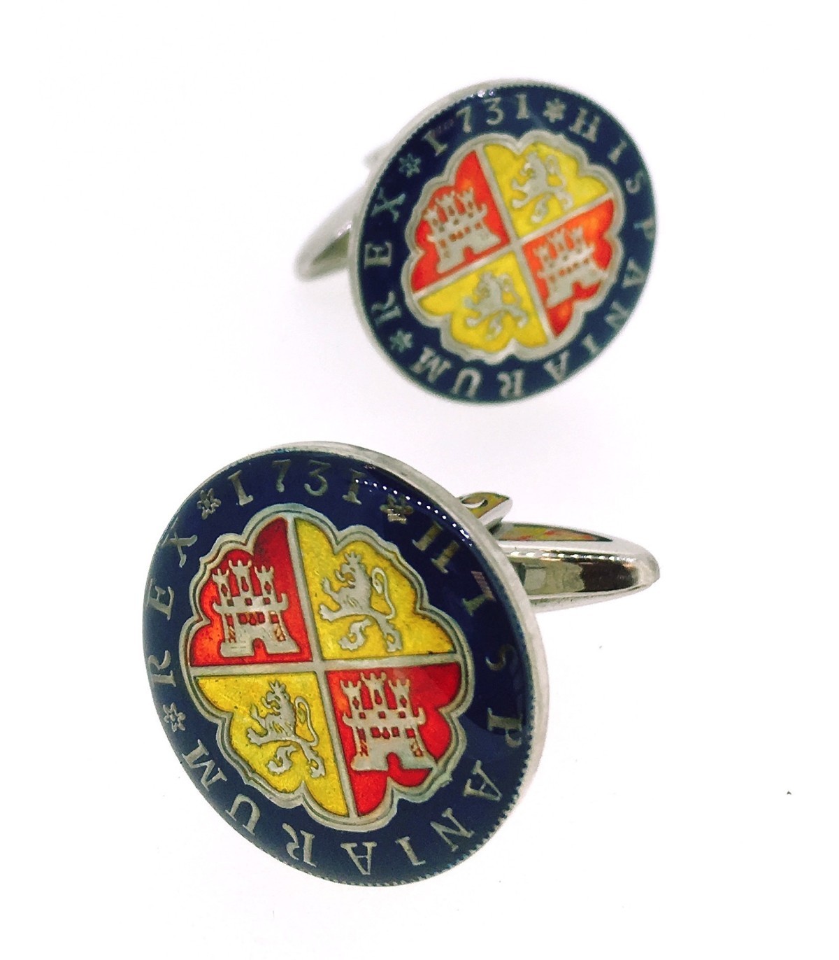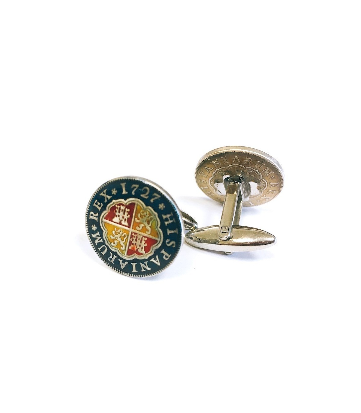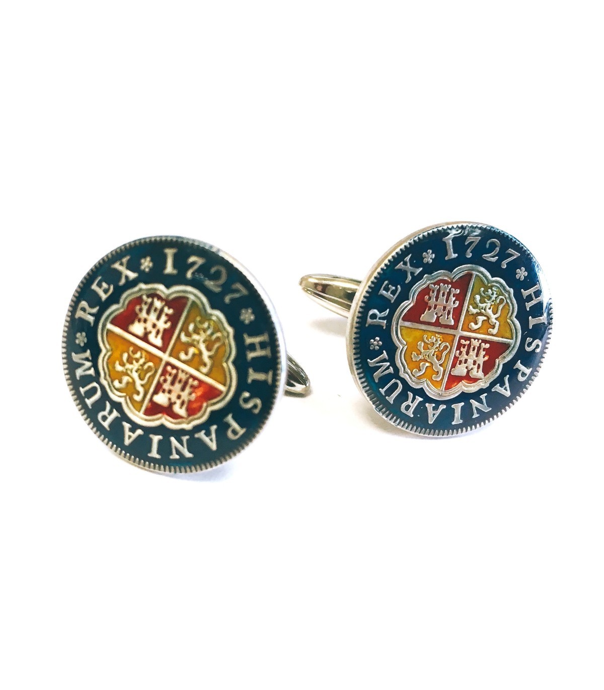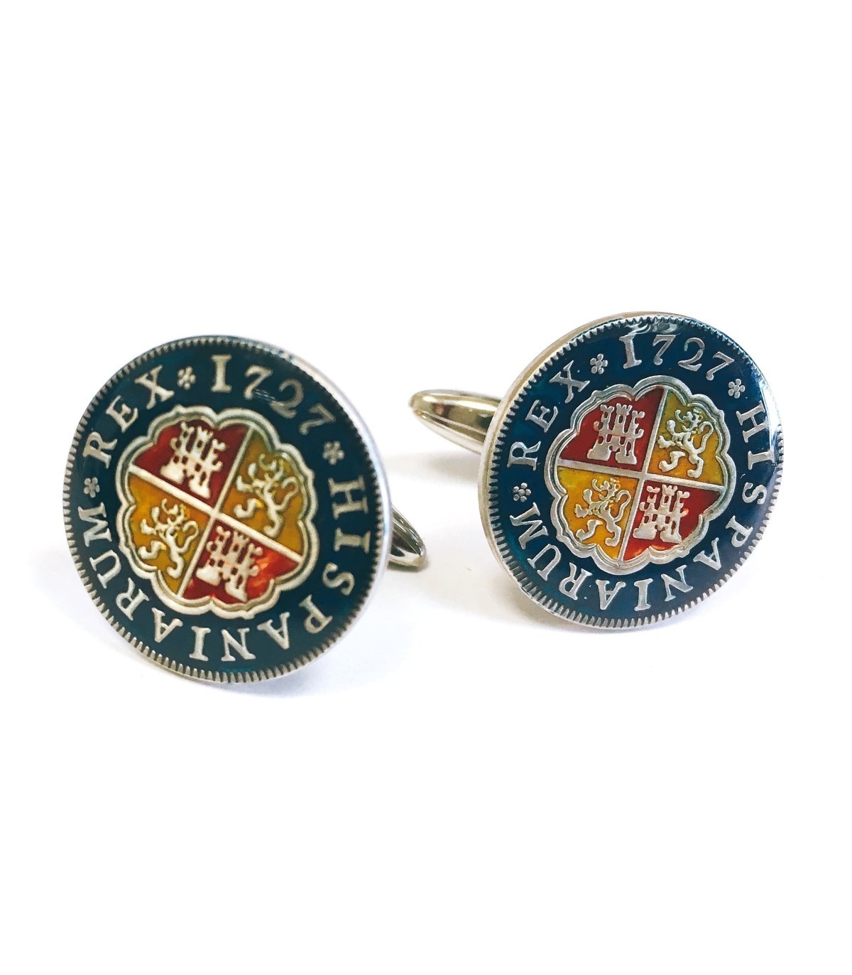 <p style= text-align: justify; ><strong>Gemelolandia.com - Gemelos Replica Moneda 1 Real Español Felipe V 1727 Color Azul Marino.</strong> <strong>Gemelos para camisa </strong>realizados a partir de una replica exacta de una moneda de 1 real español de 1727. Esta moneda se ha esmaltado a mano en color azul marino predominante, el escudo se le han dado los colores de la bandera española, .Se ha dejado las letr
