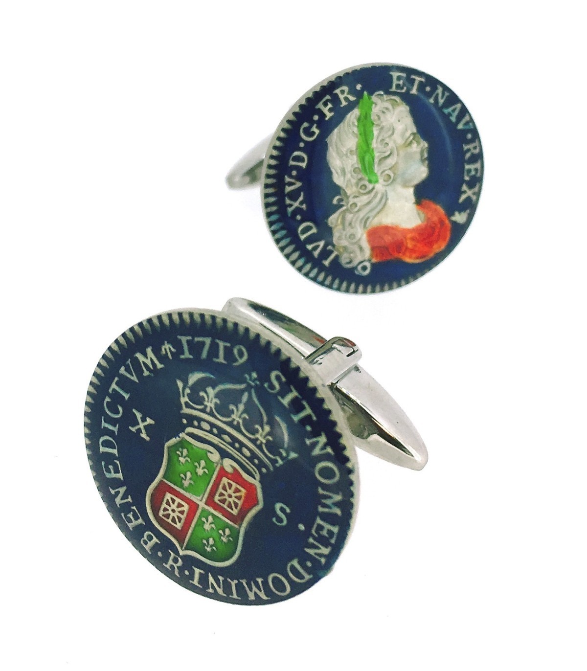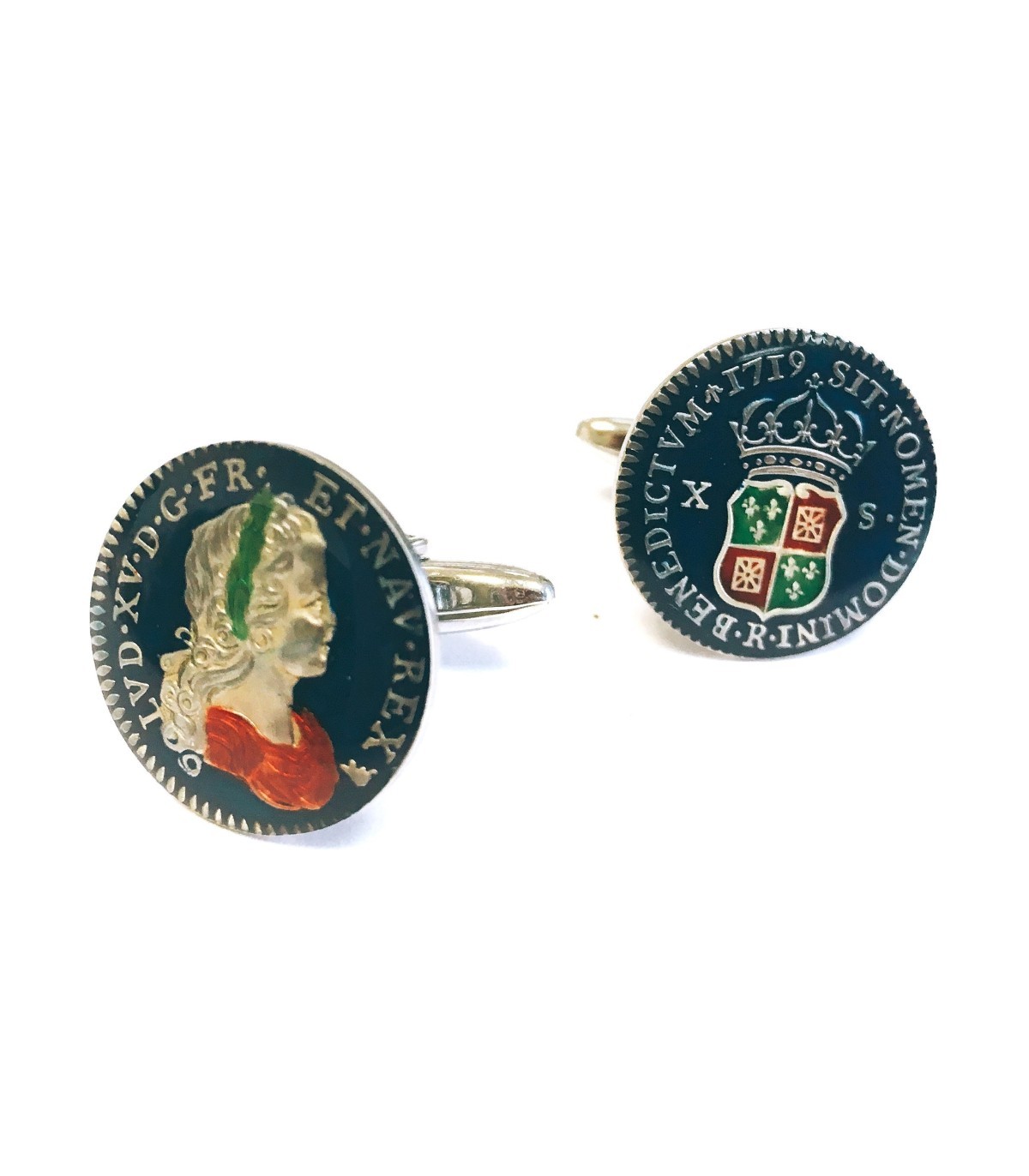 <p style= text-align: justify; ><strong>Gemelolandia.com - Gemelos Replica Moneda 10 Sol Francia Louis XV Año 1719 Azul Marino.</strong> <strong>Gemelos para camisa </strong>realizados a partir de una replica exacta de una moneda de 10 soles Francesa del año 1719. Esta moneda se ha esmaltado a mano en color azul marino predominante dejando las letras en su color plata original, y el escudo heraldico jugando con verdes y