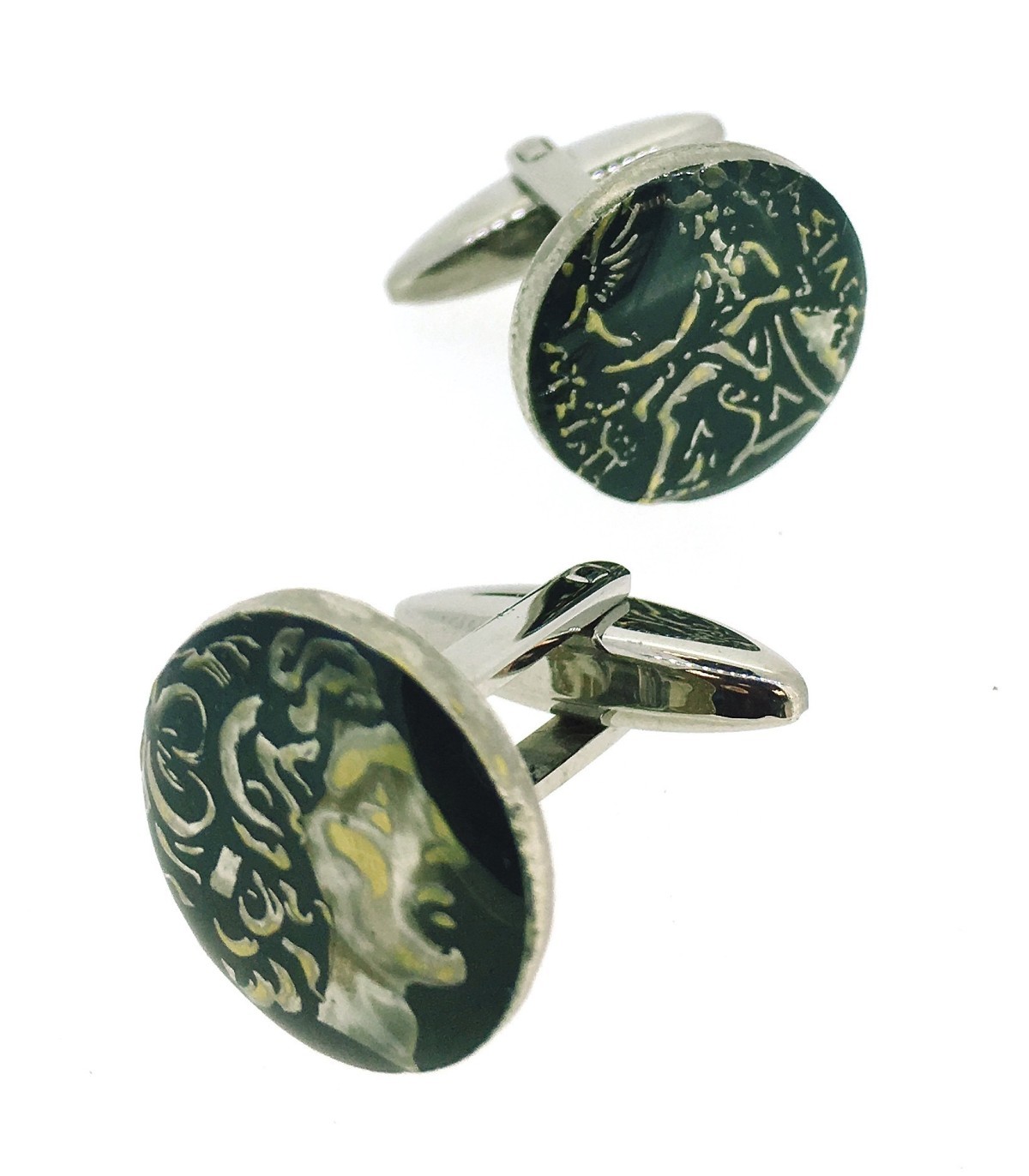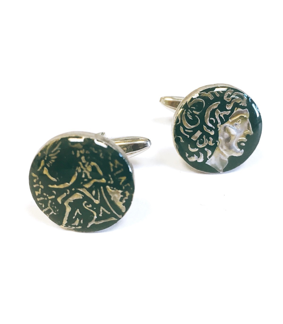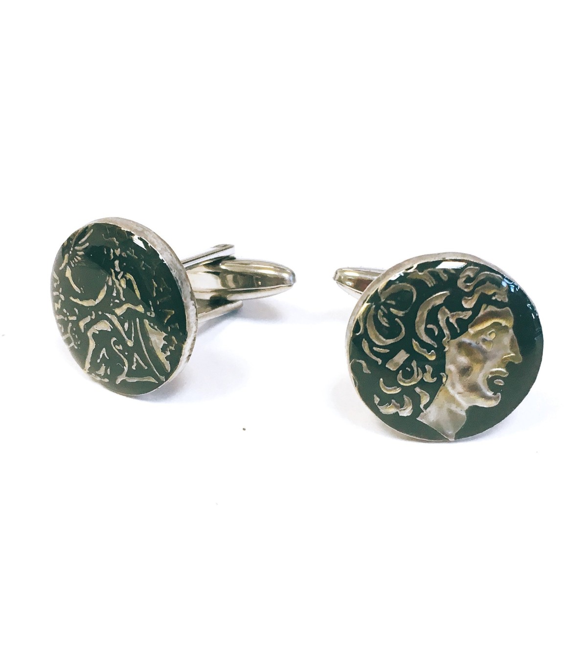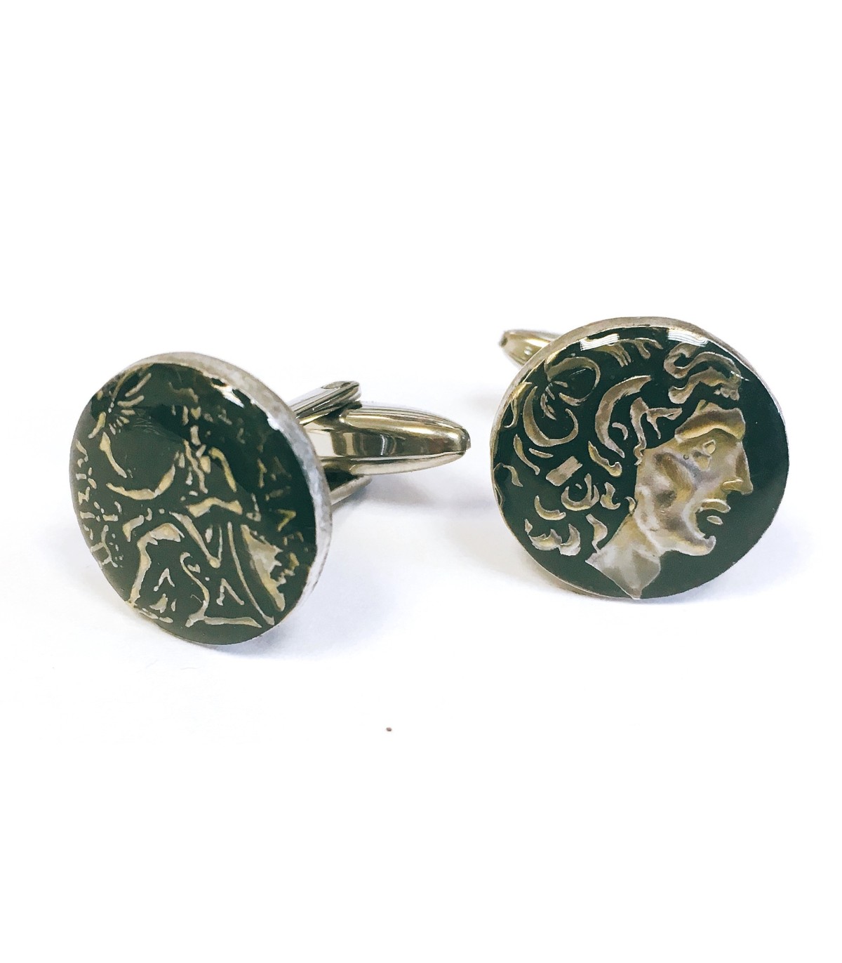 <p style= text-align: justify; ><strong>Gemelolandia.com - Gemelos Replica Moneda Alejandro Magno Dragma Antigua Grecia Color Negro.</strong> <strong>Gemelos para camisa </strong>realizados a partir de una replica exacta de una moneda de la antigua grecia con la esfinge de Alejandro Magno. Esta moneda se ha esmaltado a mano en color negro predominante. Se ha dejado las letras y los numeros en su color plata original, haciendo de estos