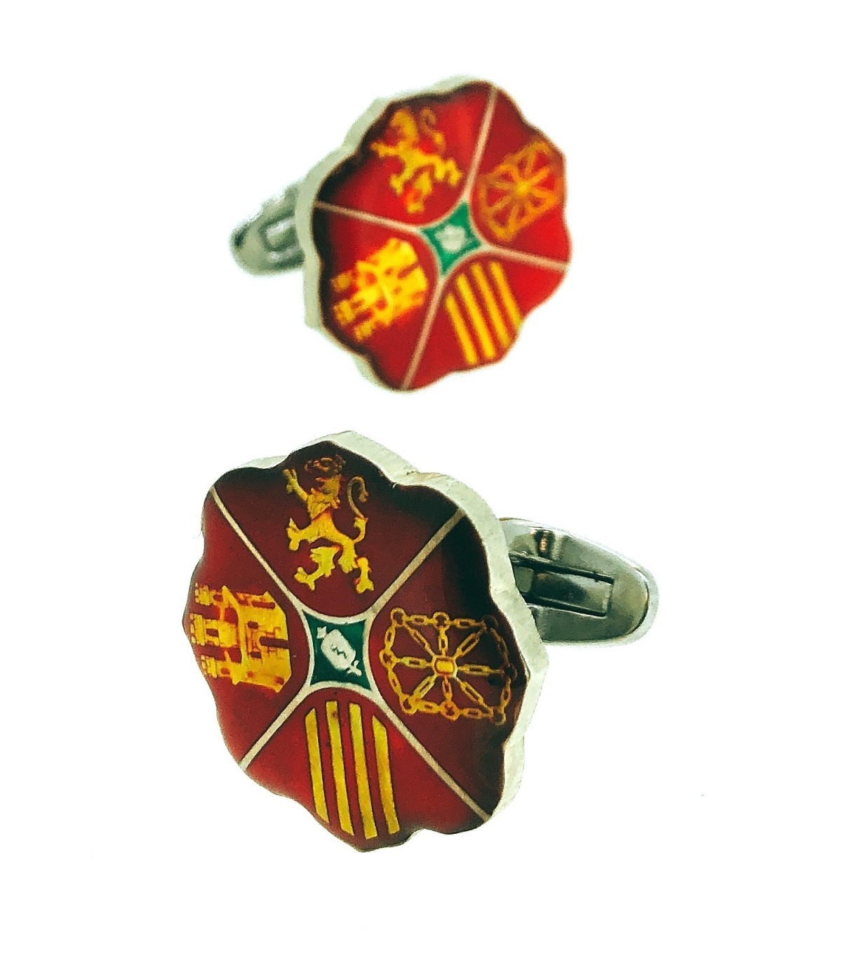 <p style= text-align: justify; ><strong>Gemelolandia - Gemelos Camisa Moneda de Plata de Ley de 100 Pesetas año 1969 Recortada ) </strong>Tamaño perfecto de 23 mm. Gemelos fabricados a partir de una moneda de 100 pesetas de la epoca de Francisco Franco de Plata de Ley, que ha sido recortada a segueta y se ha pintado a mano los cinco reinos que componen el escudo de armas del Estado Español.<strong></strong></p>