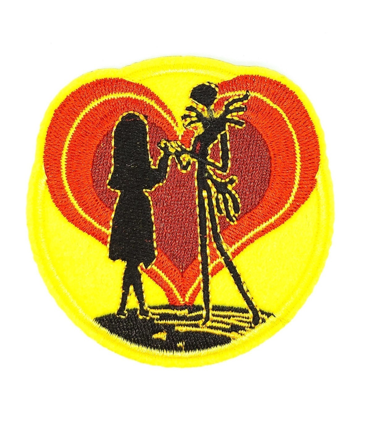 <p><strong>Gemelolandia -Parche Termoadhesivo Pesadilla Antes de Navidad 8cm-</strong> Diámetro de 8cm. Parche Bordado Termoadhesivo que representa los dos personajes principales de la película Pesadilla Antes de Navidad enamorados (Jack y Sally) sobre un fondo con forma de corazón.</p>