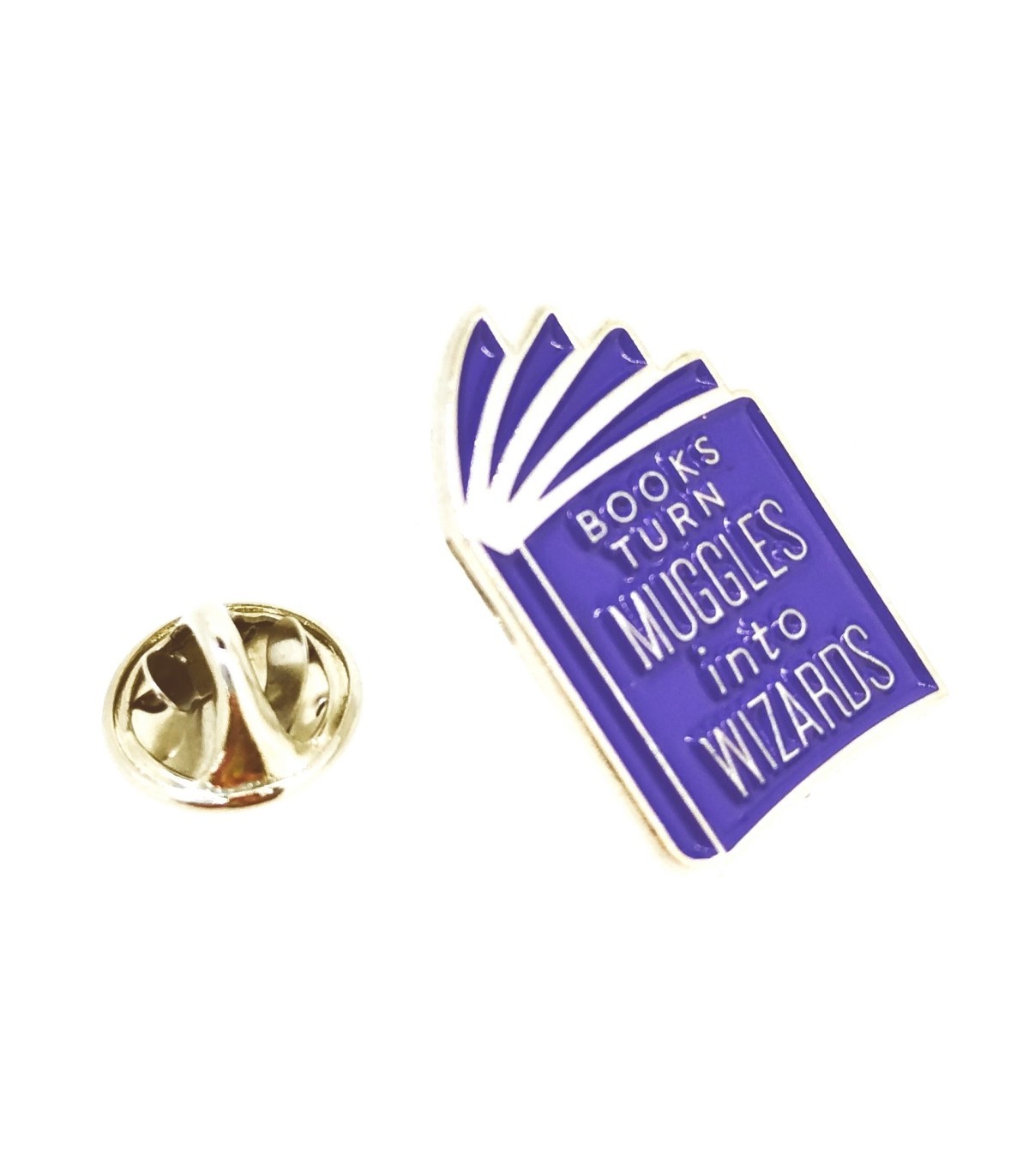 <p>Gemelolandia presenta este pin que representa un libro con la frase: Books turn Muggles into Wizards </p>