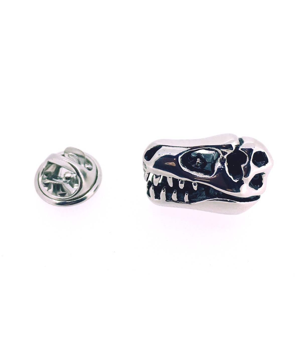 <p style= text-align: justify; ><strong></strong>Pin de solapa que representa fielmente una calavera del dinosaurio T REX en tono plateado. Este pin está fabricado en latón y esmalte.</p>