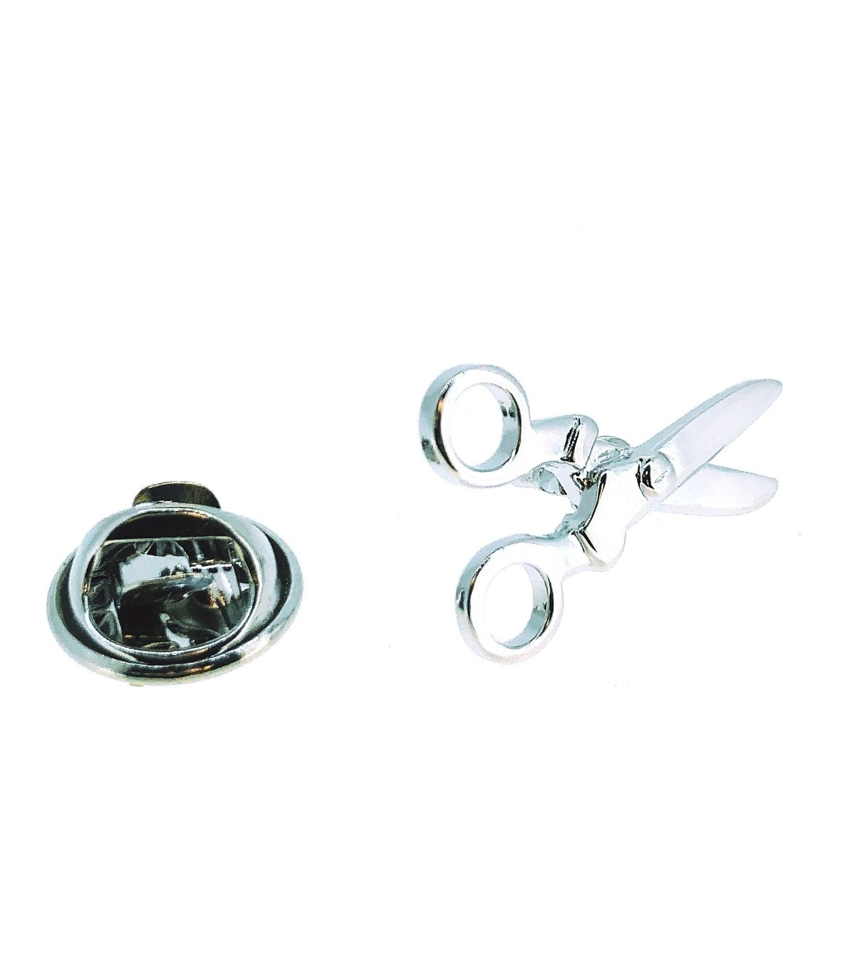 <p>Pines <span>realizados en latón que representan el símbolo de unas tijeras en color plateado.<span><br /></span></span></p>