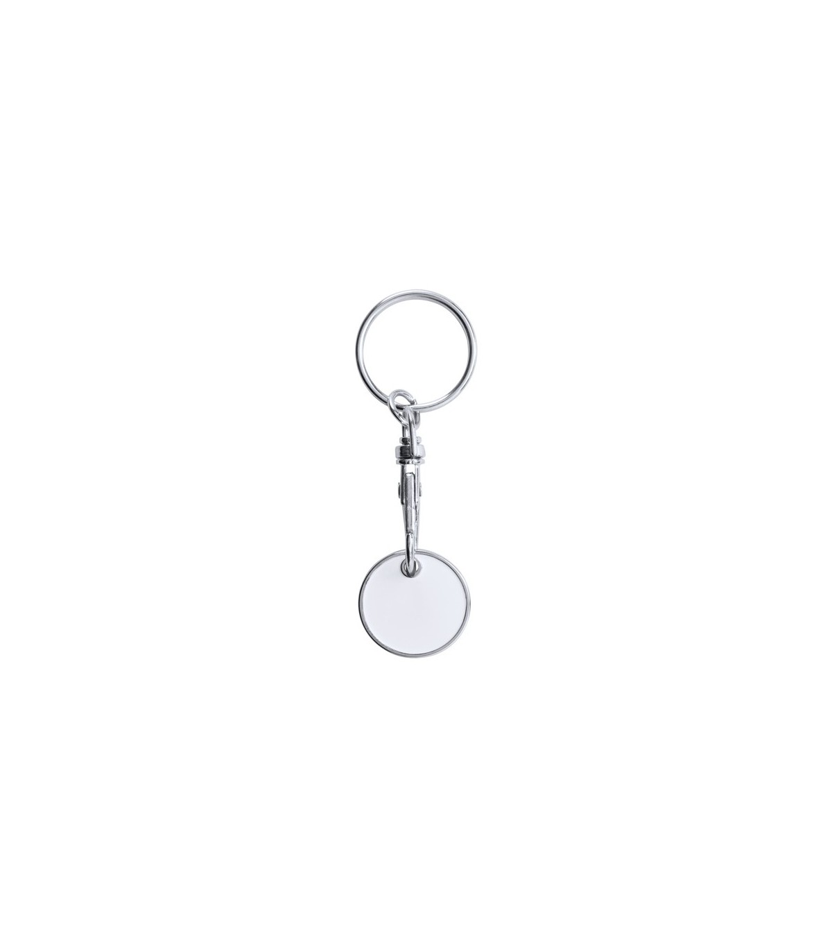 Llavero moneda para carro compra. Metálico con esmalte color.