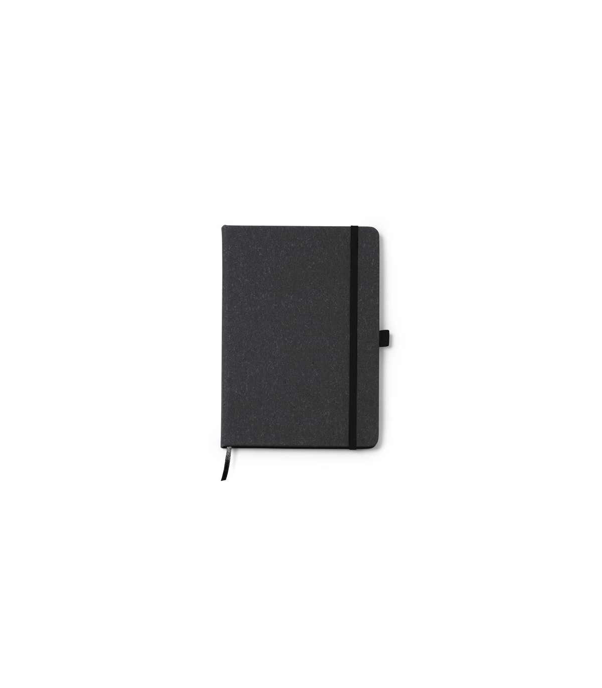 Bloc de notas A5 con tapa rígida elaborada con piel reciclada. Marcapáginas y banda elástica de cierre. Cuenta con 100 hojas a una línea.