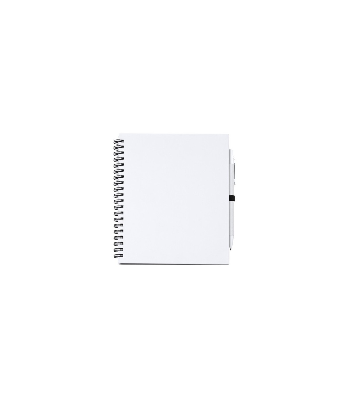 Libreta con espiral, compuesta por 70 hojas de papel liso y soporte para bolígrafo. Tapas rígidas y bolígrafo de cartón reciclado a juego.