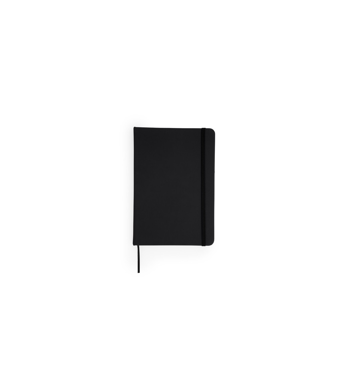 Bloc de notas A6 con tapa rígida de polipiel. Marcapáginas y banda elástica. 100 hojas.