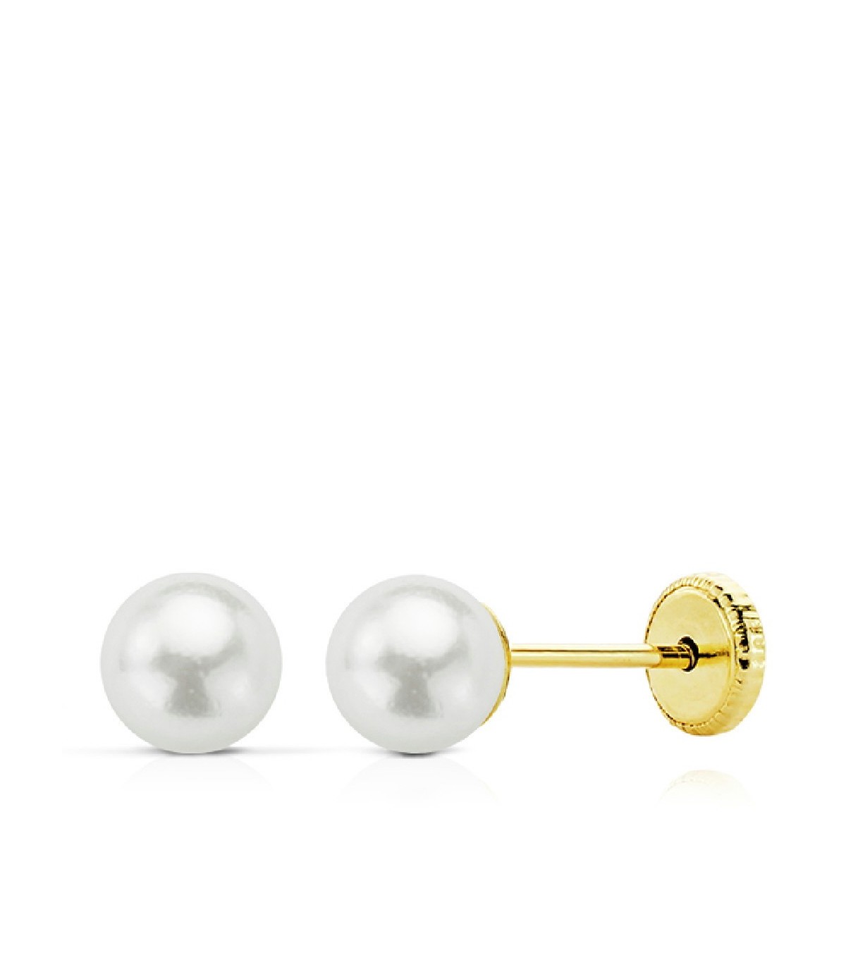 Pendientes para bebés o niñas. Fabricado en oro Amarillo 18 ktes. Perla cultivada tamaño 4,5 mm. Cierre tuerca. Certificado de garantía y de calidad. Se presenta en estuche y bolsa