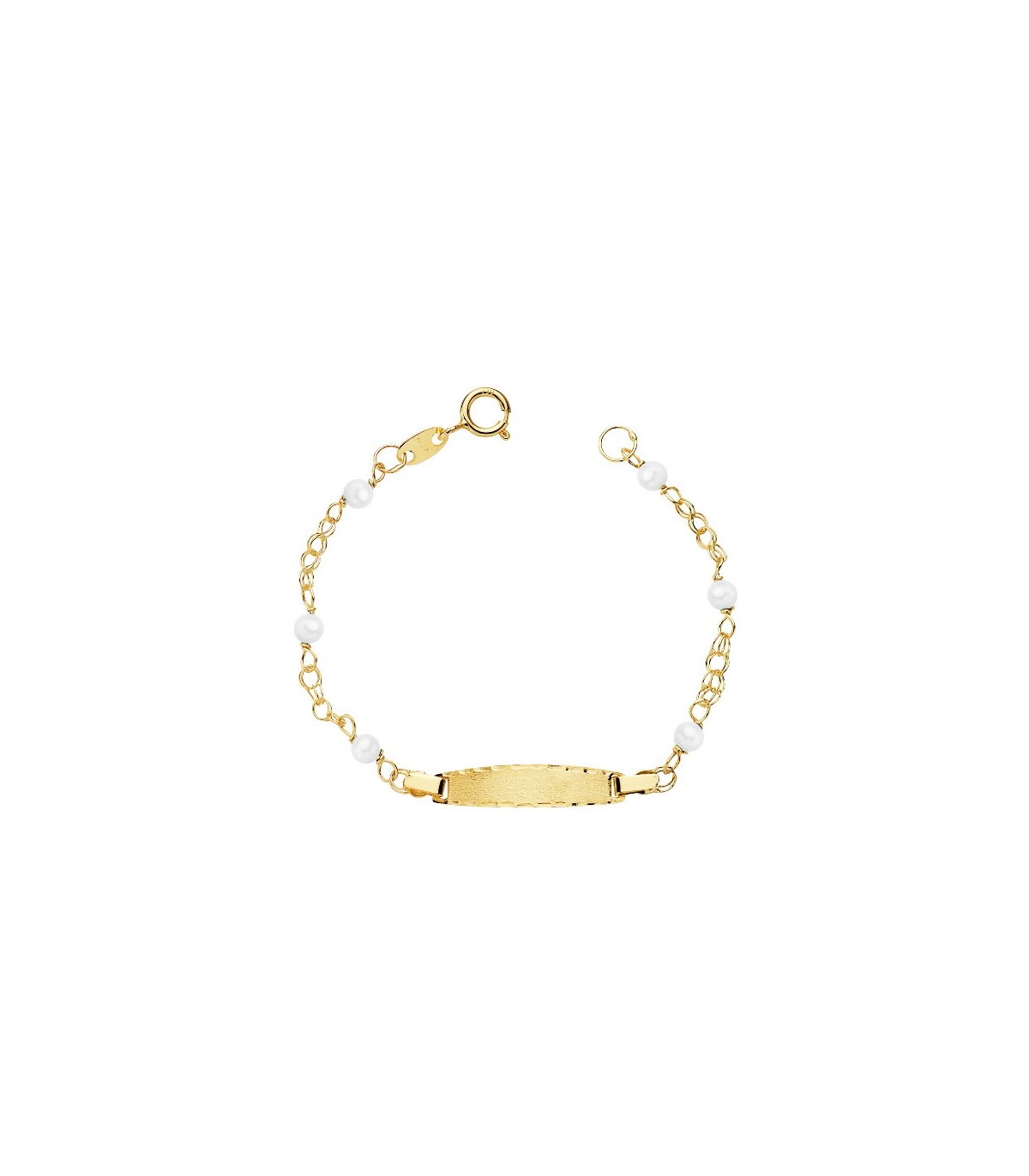 Esclava para niñas. Oro amarillo 18 ktes. Modelo perlas. Perla natural blanca 6 mm. Chapa mate y brillo tamaño 6 x 25 mm. Cierre reasa. Medida 17,5 cm. Certificado de garantía y de calidad. Se presenta en estuche y bolsa.