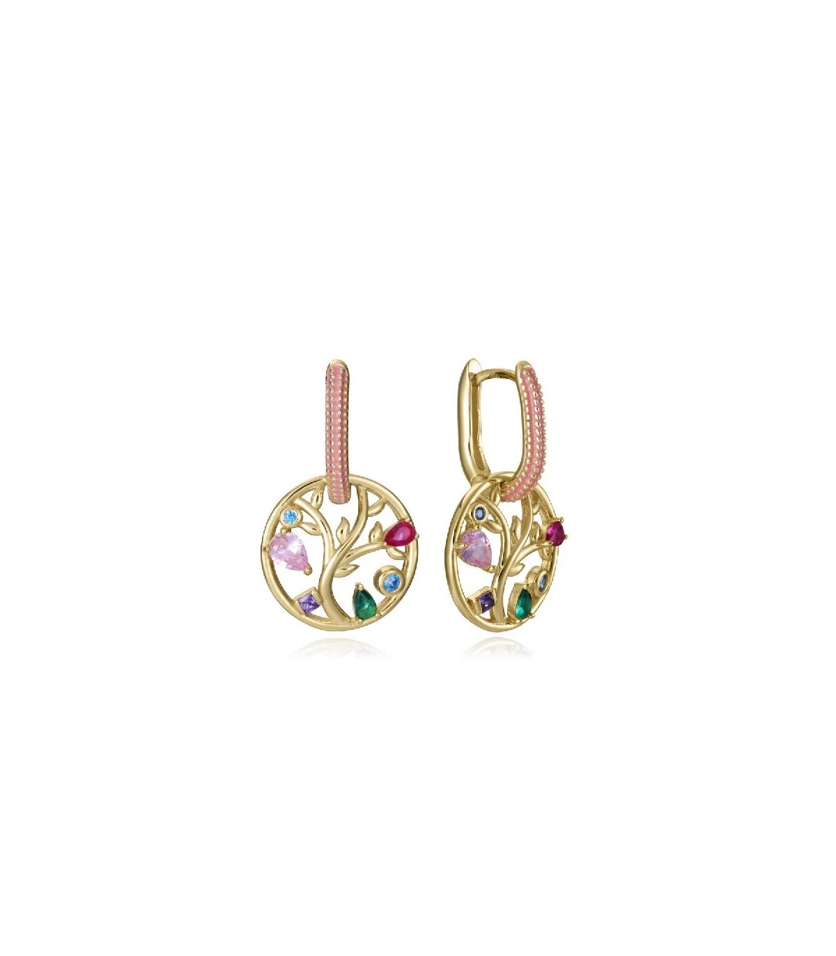 Estos encantadores pendientes de plata de ley con baño de oro combinan modernidad y significado en un diseño único. Presentan un aro adornado con esmalte rosa que aporta un toque de frescura y color, mientras que el colgante del árbol de la vida, símbolo de crecimiento y conexión, está decorado con circonitas de colores que añaden brillo y vitalidad. Con un largo de 24 cm, estos pendientes son perfectos para ocasiones especiales, aportando un estilo sofisticado y alegre. Ideales para la mujer que busca un accesorio lleno de simbolismo y color, perfectos para realzar cualquier look.