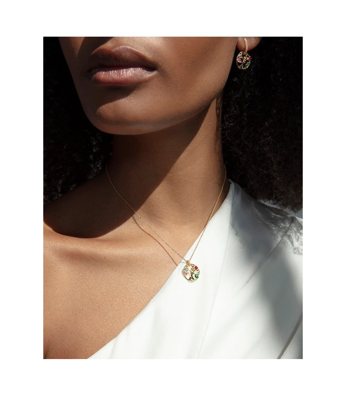 Collar de plata de primera ley con baño de oro con aro con esmalte rosa y colgante del arbol de la vida con circonitas de colores largo 42 +3 cm extensión.