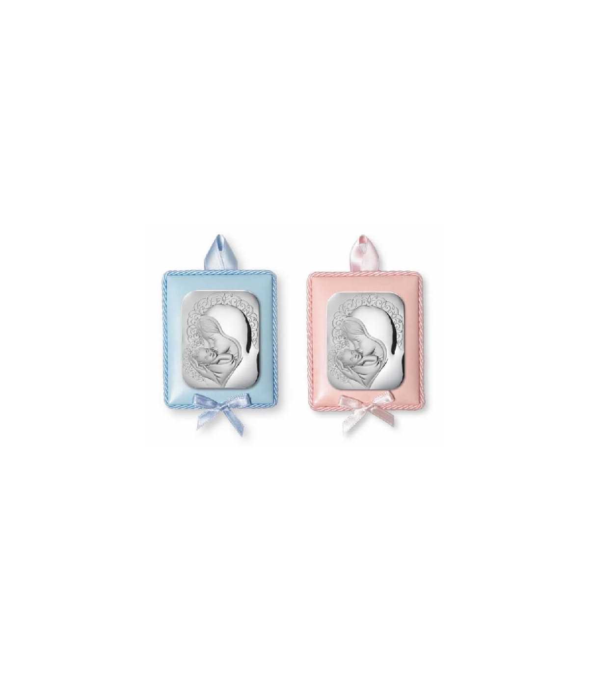 Medallón de cuna para niñas. Fabricado en plata de ley bilaminada.Imagen Virgen y el Niño. Cuero color rosa. Tamaño 7 x 9 cm.