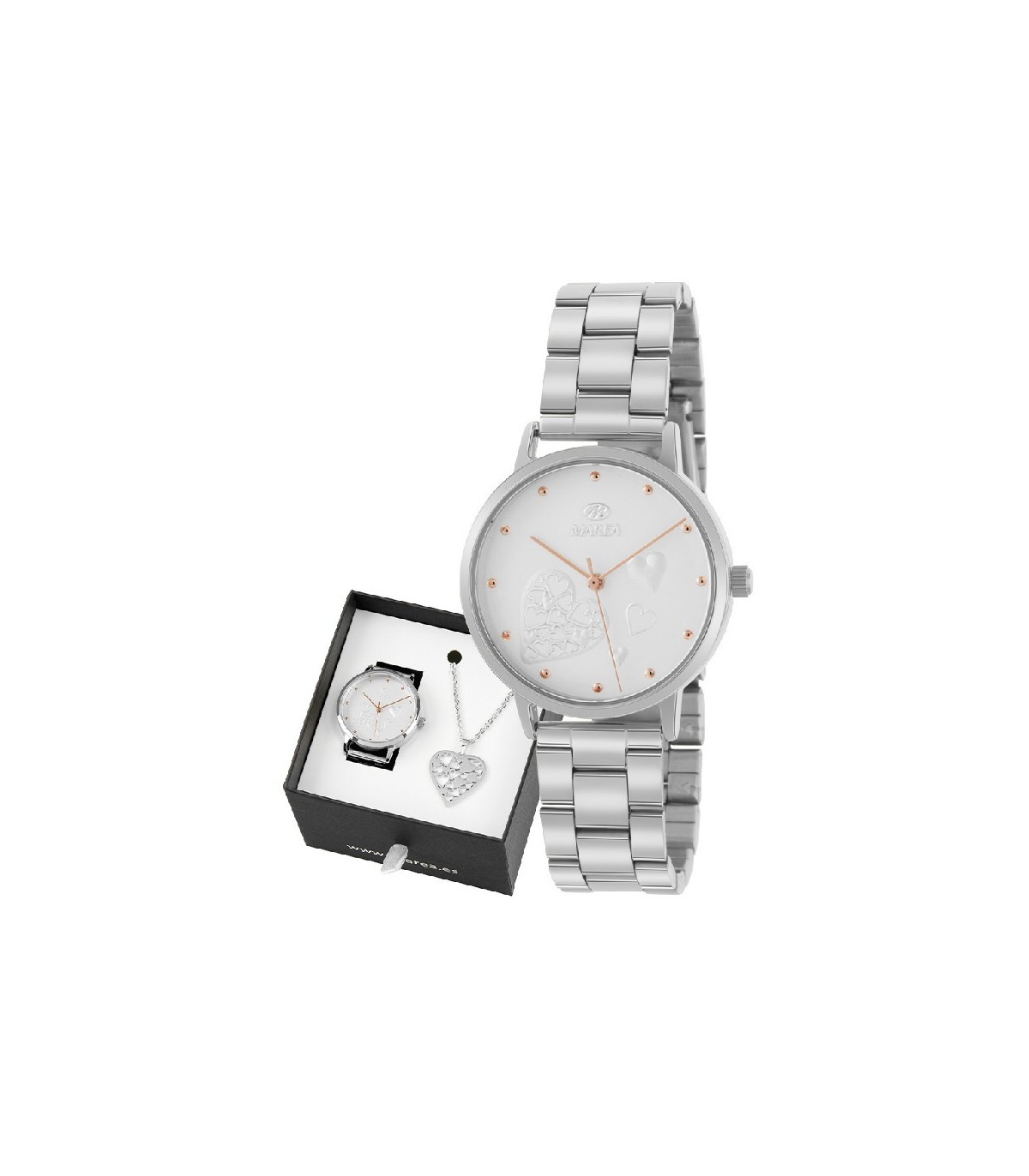 Reloj para mujer MAREA. Pack reloj y colgante corazón calado. Reloj cuarzo analógico tres agujas. Caja y brazalete metal plateado. Tamaño 33 mm. Resistente al agua 5 atm. Garantía del fabricante 3 años.