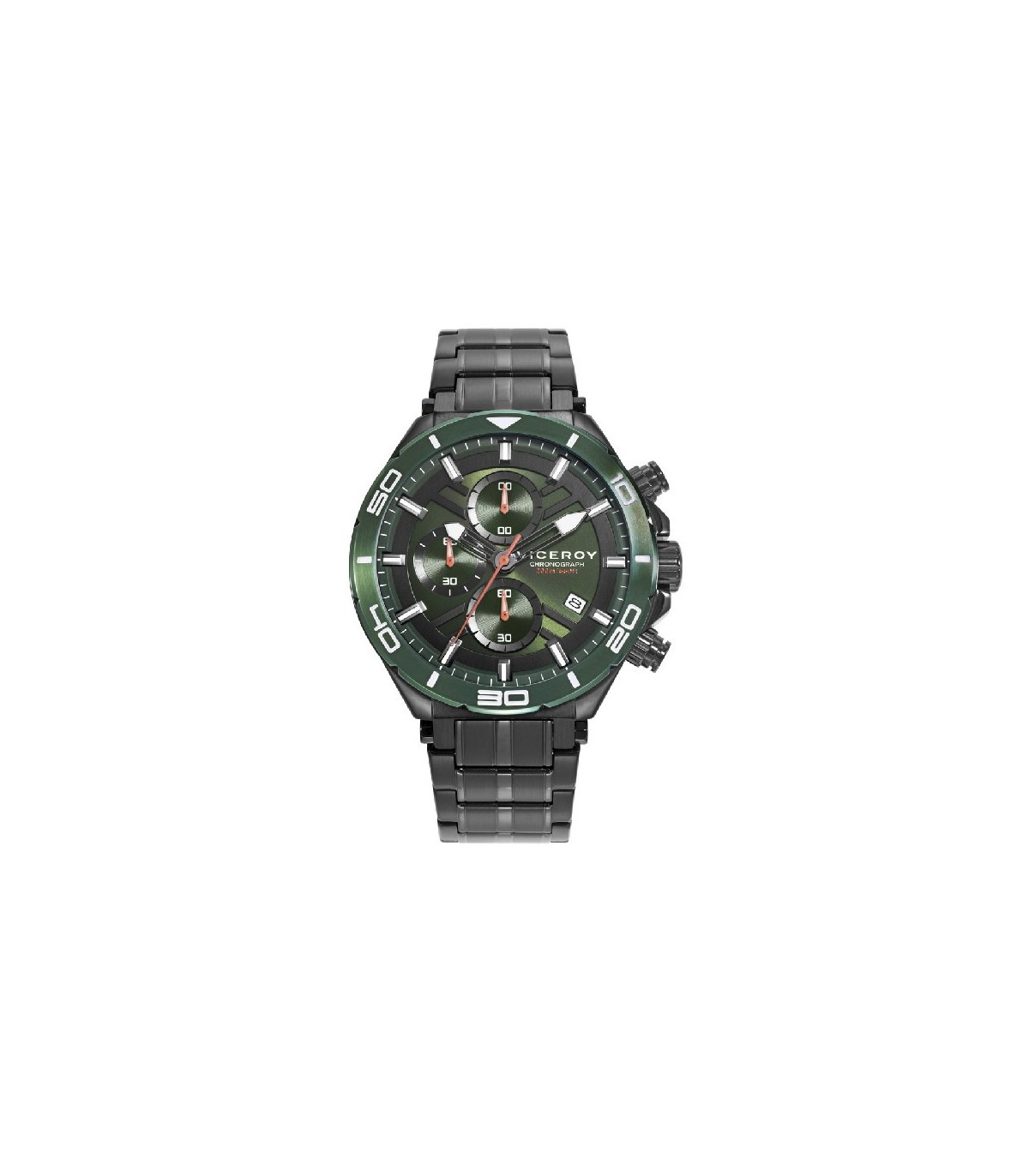 Reloj para hombre VICEROY. Cuarzo crono. Caja y brazalete acero negro. Esfera color verde. Tamaño 44 mm. Resistente al agua 200 m. Garantía del fabricante 3 años. Se presenta en estuche y bolsa.