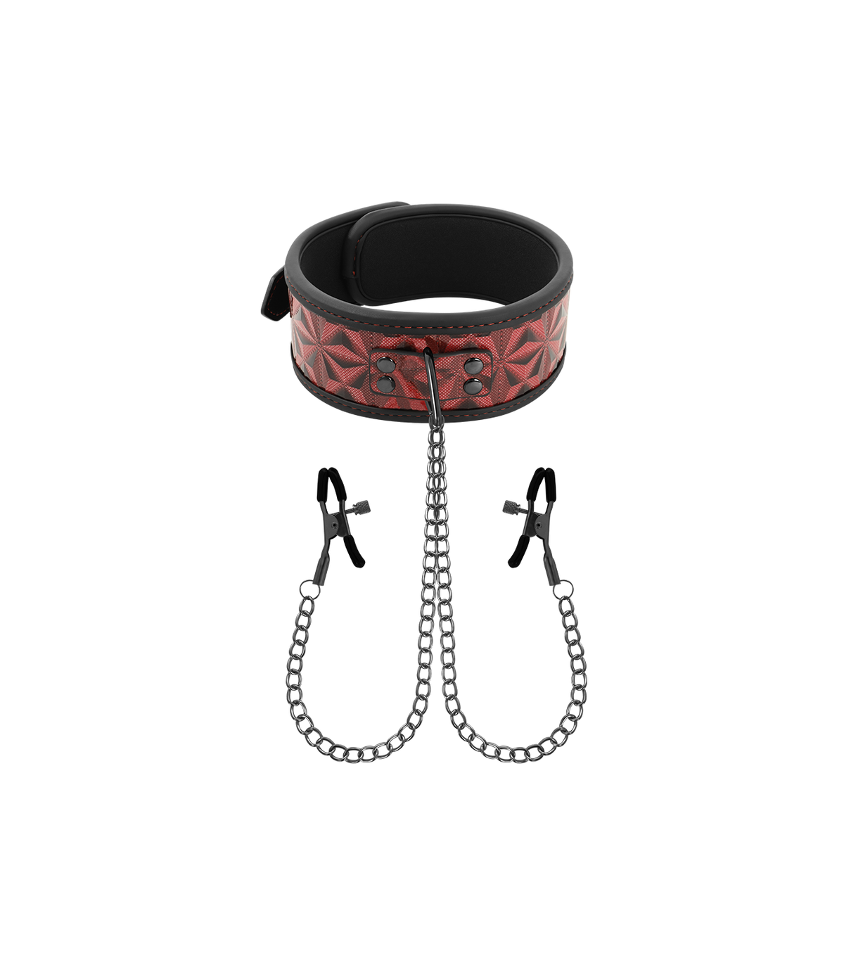 ¿Preparado para el placer máximo?, unido por una cadena de plata a pinzas para pezones. Un juego bondage excitante sobre todo para ellas. Las pinzas y el collar son ajustables tanto de medida como la tensión. Es perfecto para la estimulación de los pezones y muchas otras áreas sensibles.