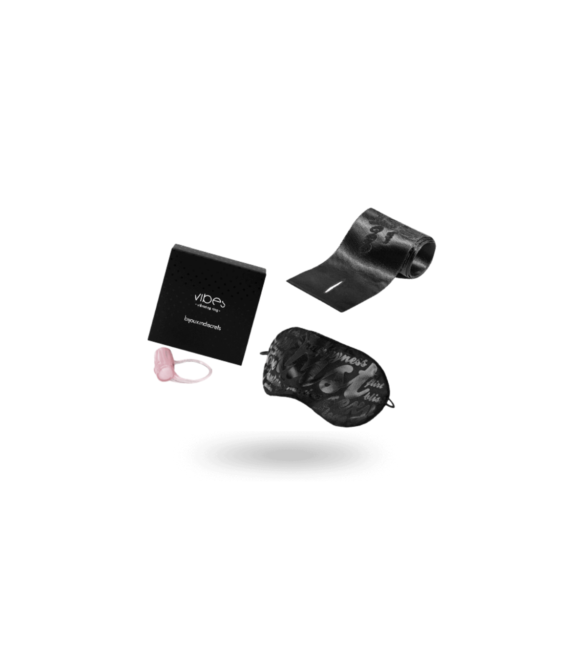 - Contenidos: Anillo vibrador; Esposas de satén; Antifaz satinado.