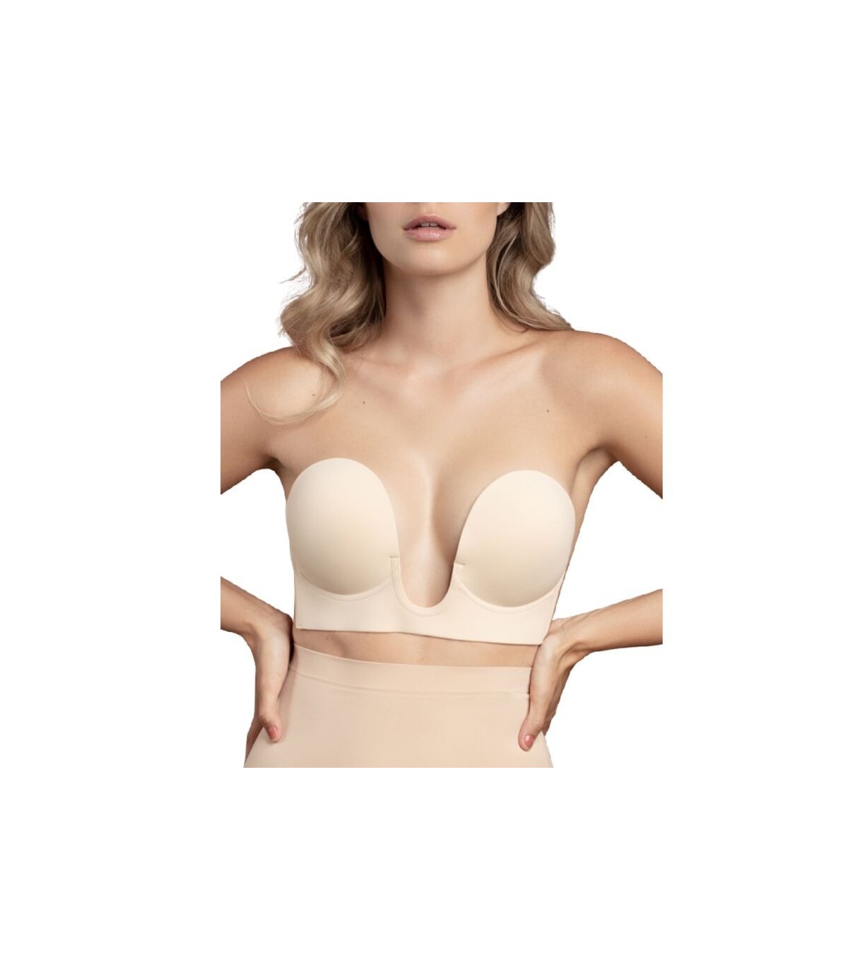 El sujetador de estilo U ofrece una solución impecable para un corte bajo o escotada.  El sujetador de estilo U levanta y realza los pechos para esos escotes profundos. El soporte adhesivo adicional en la base del sujetador está diseñado para aumentar la comodidad y la fiabilidad
