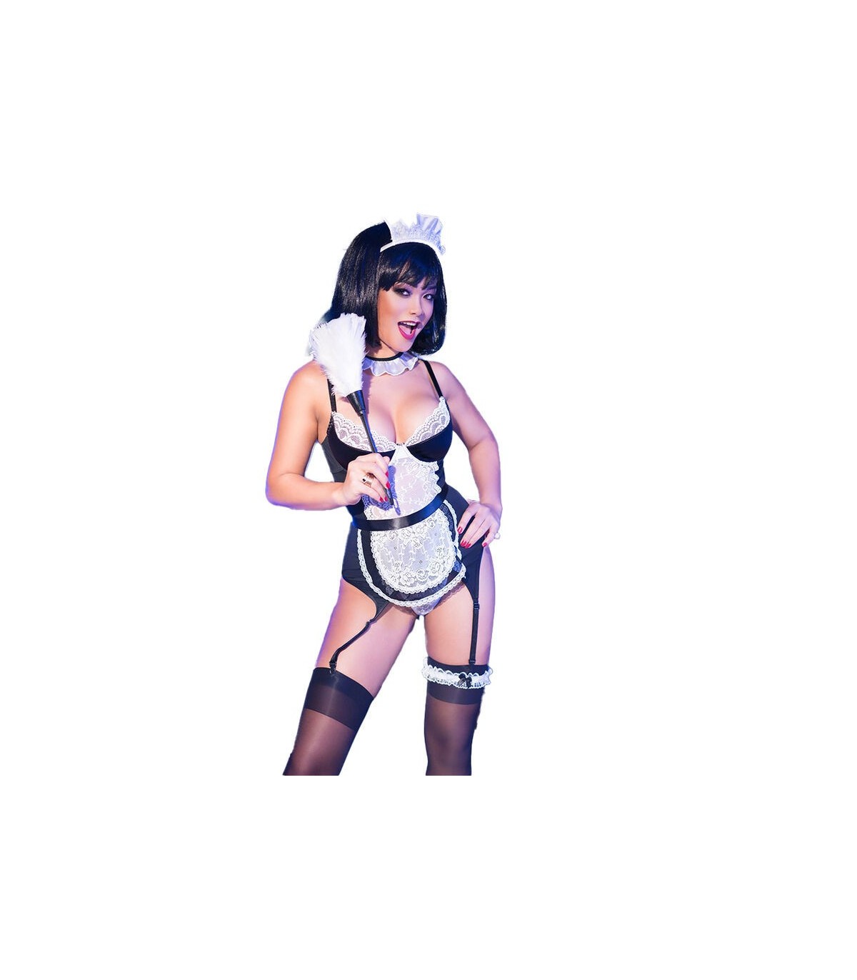 Este set exuda sofisticación y atractivo en cada detalle, desde la delicada banda que adorna tu cabello hasta las sensuales medias que abrazan tus piernas con su encanto oscuro. Cada pieza ha sido cuidadosamente seleccionada para crear una experiencia de seducción inolvidable.