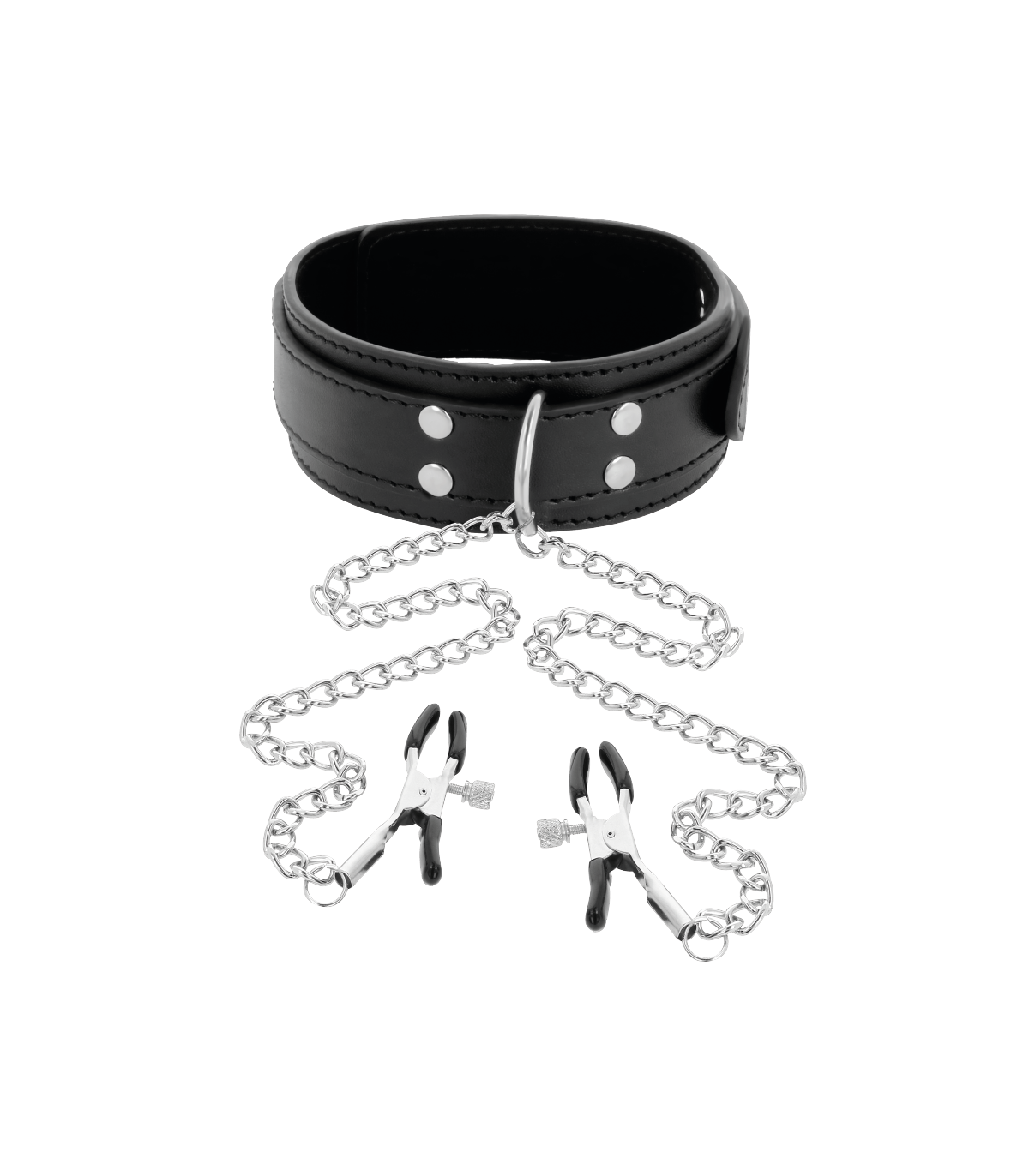 Glamuroso y atrevido collar, unido por una cadena de plata a pinzas para pezones. Un juego bondage excitante sobre todo para ellas. Las pinzas y el collar son ajustables tanto de medida como la tensión. Es perfecto para la estimulación de los pezones y muchas otras áreas sensibles.