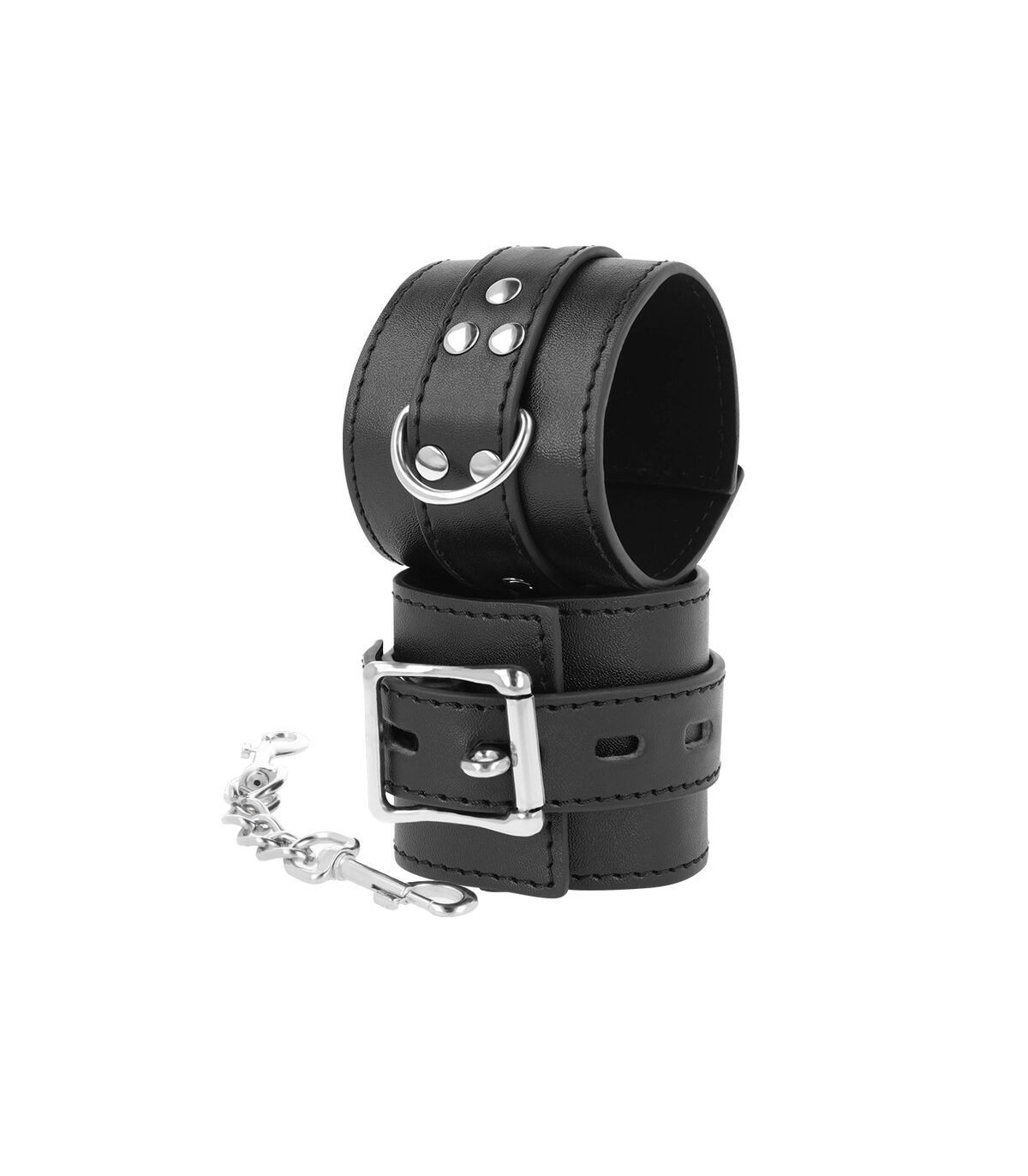 Nos encantan estas esposas de piel sintética con cadenas fuertes y hebillas de metal resistentes.