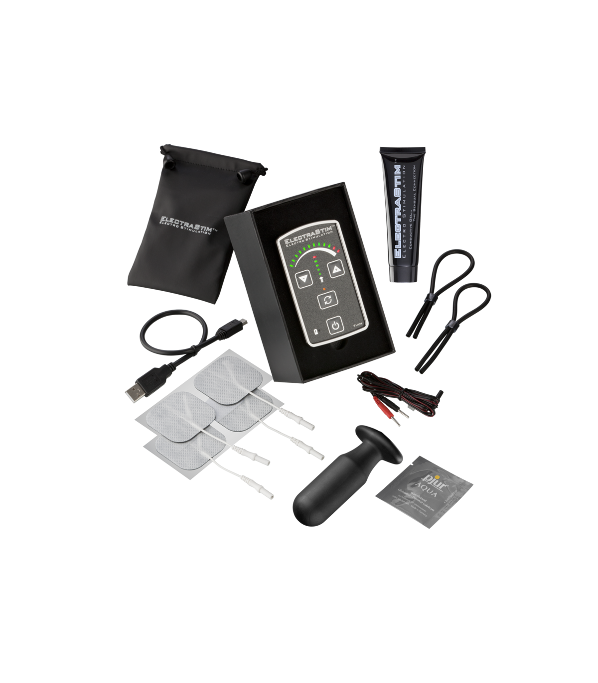 El paquete de ElectraStim Flick EM60-M incluye un estimulador, todos los cables necesarios, un conjunto de 4 ElectraPads, 2 anillos para el pene ajustables ElectraLoops y un electrodo Silicone Noir Aura (adecuado para su uso vaginal y anal).
