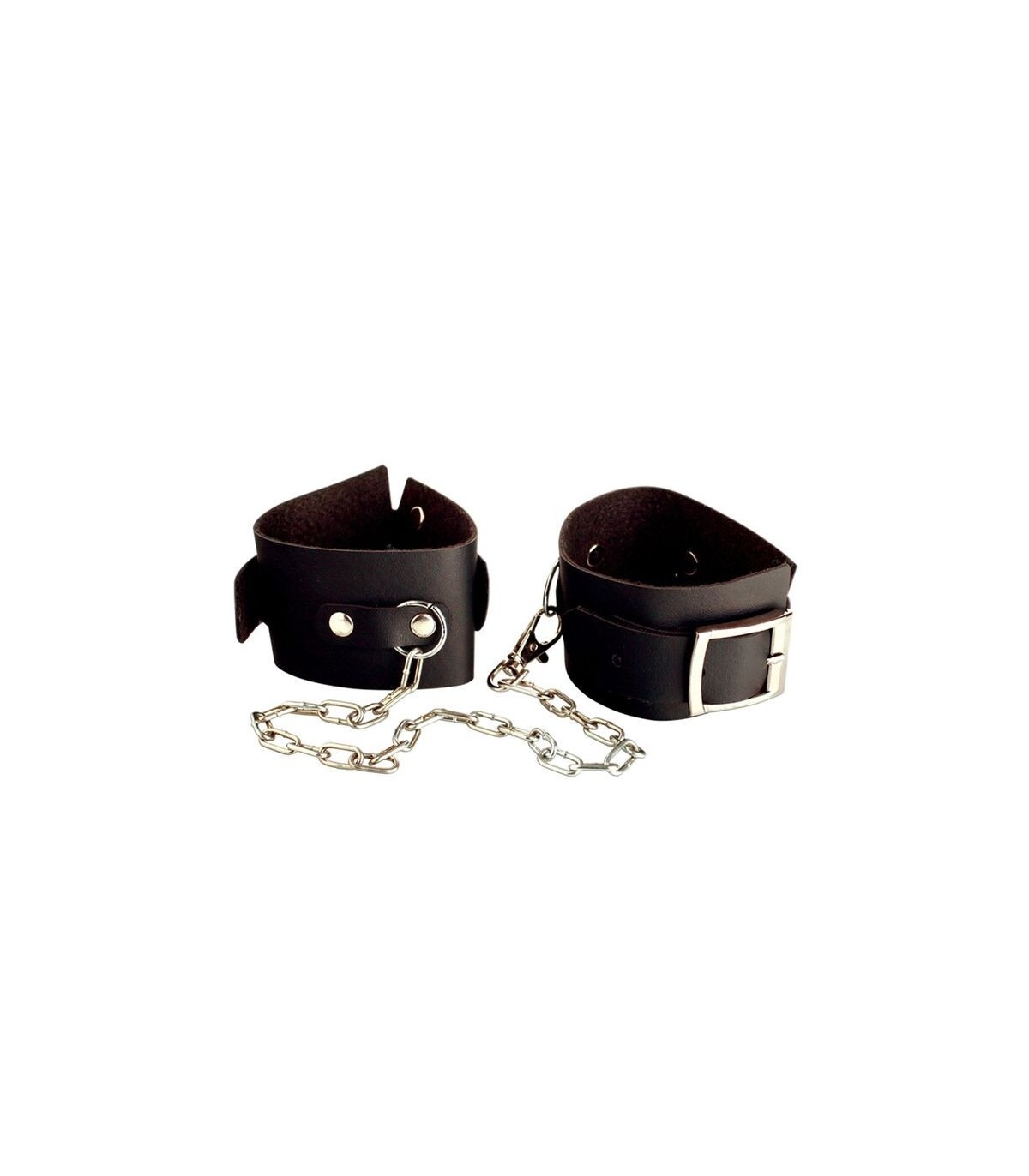 Fabuloso kit de esposas con cadena metálica para muñecas y tobillos de cuero, de la colección FETISH FANTASY SERIES.