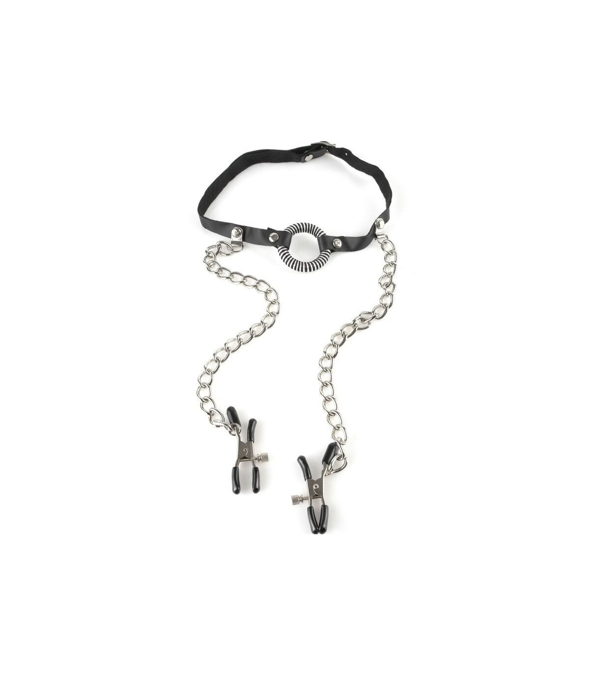 El producto consiste en un pequeño anillo de metal como mordaza, envuelto en cuero, conectado a dos correas también de cuero resistente para ajustarlo al cuello y dos cadenas con pinzas para los pezones. Gracias a sus correas de cuero regulables, puede adaptarse a los tamaños y tensiones deseadas. Tirando del anillo con la boca abierta, controlas la tensión de las pinzas. Las correas de cuero son ajustables para adaptarse a la mayoría de los tamaños.