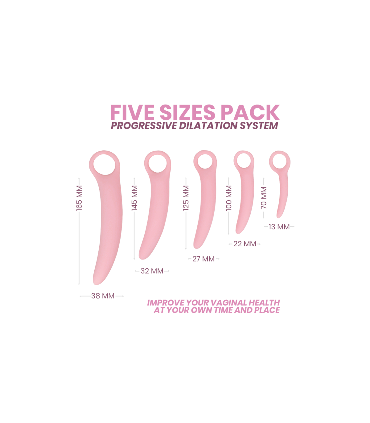 El elegante conjunto contiene 5 dilatadores, que varían en tamaño para la dilatación gradual. Son fáciles de usar gracias al bucle dedo y son una manera perfecta de ejercicio para mujeres con problemas relativos ajuste íntimo. El conjunto está hecho de silicona de alta calidad y viene en un empaque de buen gusto y contemporáneo.