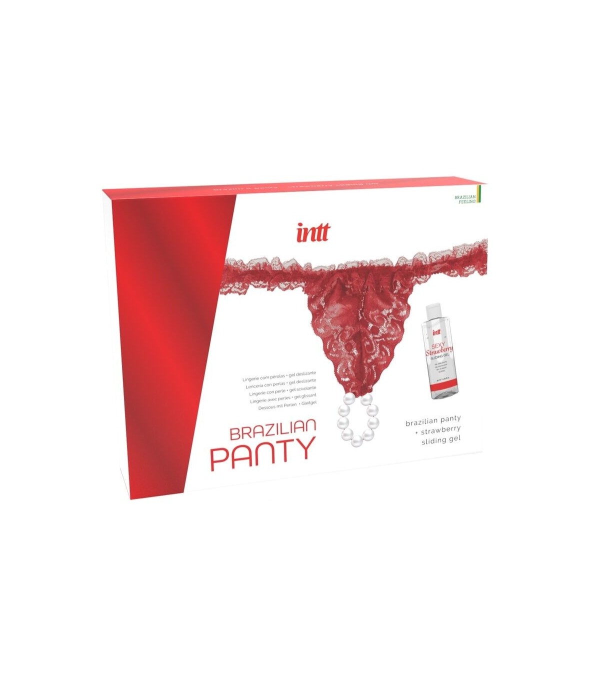 Brazilian Panty Red de INTT es un sensual pack de lencería con perlas acompañado de un gel a base de agua con sabor a fresa.
