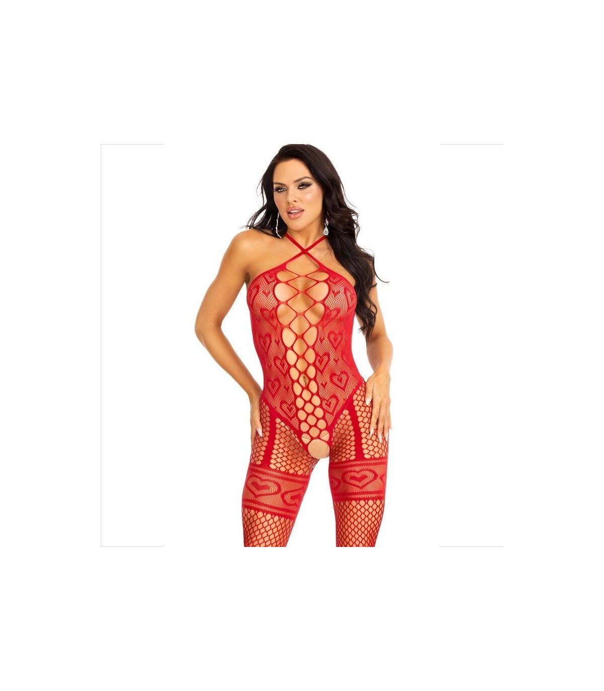 El cuello halter agrega un toque de gracia y sensualidad, realzando la línea del cuello y proporcionando una silueta favorecedora. La red de corazones, por su parte, agrega un elemento juguetón y romántico, permitiendo que la piel se asome de manera sugerente.