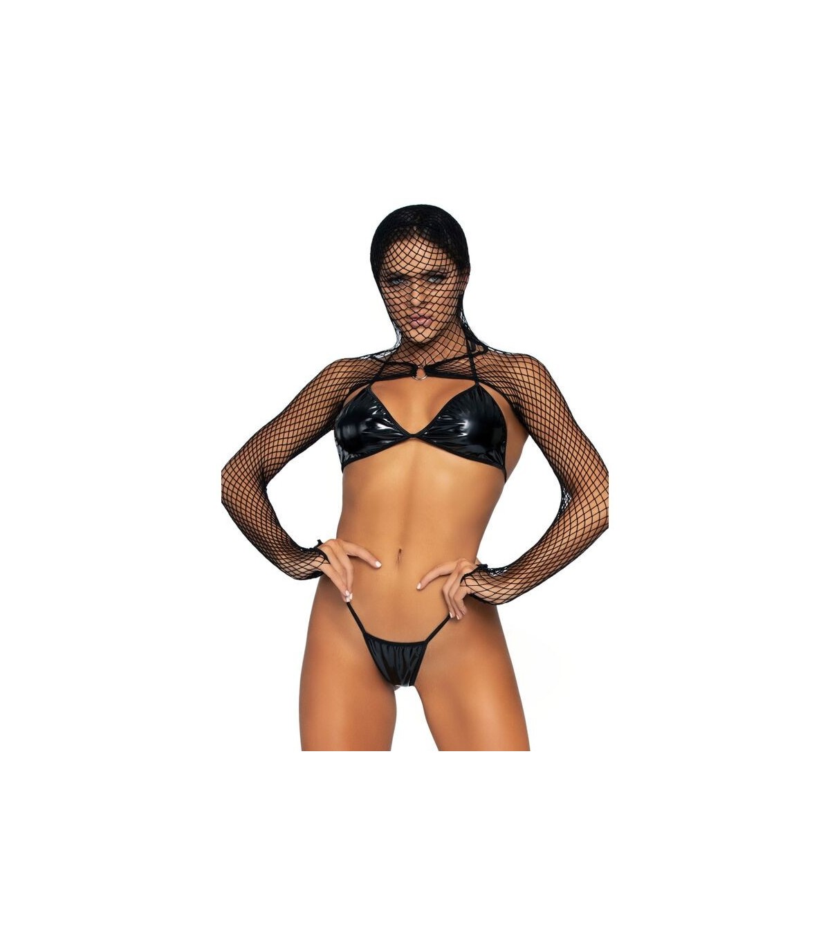 Conjunto que incluye un top bikini y un tanga de vinilo con cubrecabeza y brazos de red con un aro creados por Kink by Leg Avenue, sensuales modelos para llevar a cabo tus fantasías más oscuras con lencería de exclusivo diseño y materiales de primera calidad.