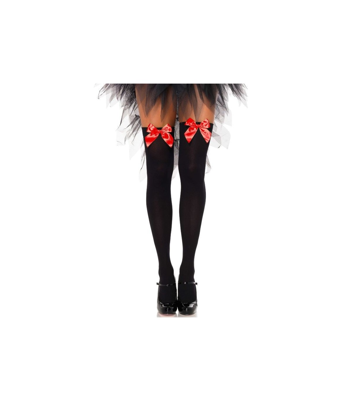 LEG AVENUE - BLACK NYLON THIGH HIGHS WITH RED BOW ONE SIZE