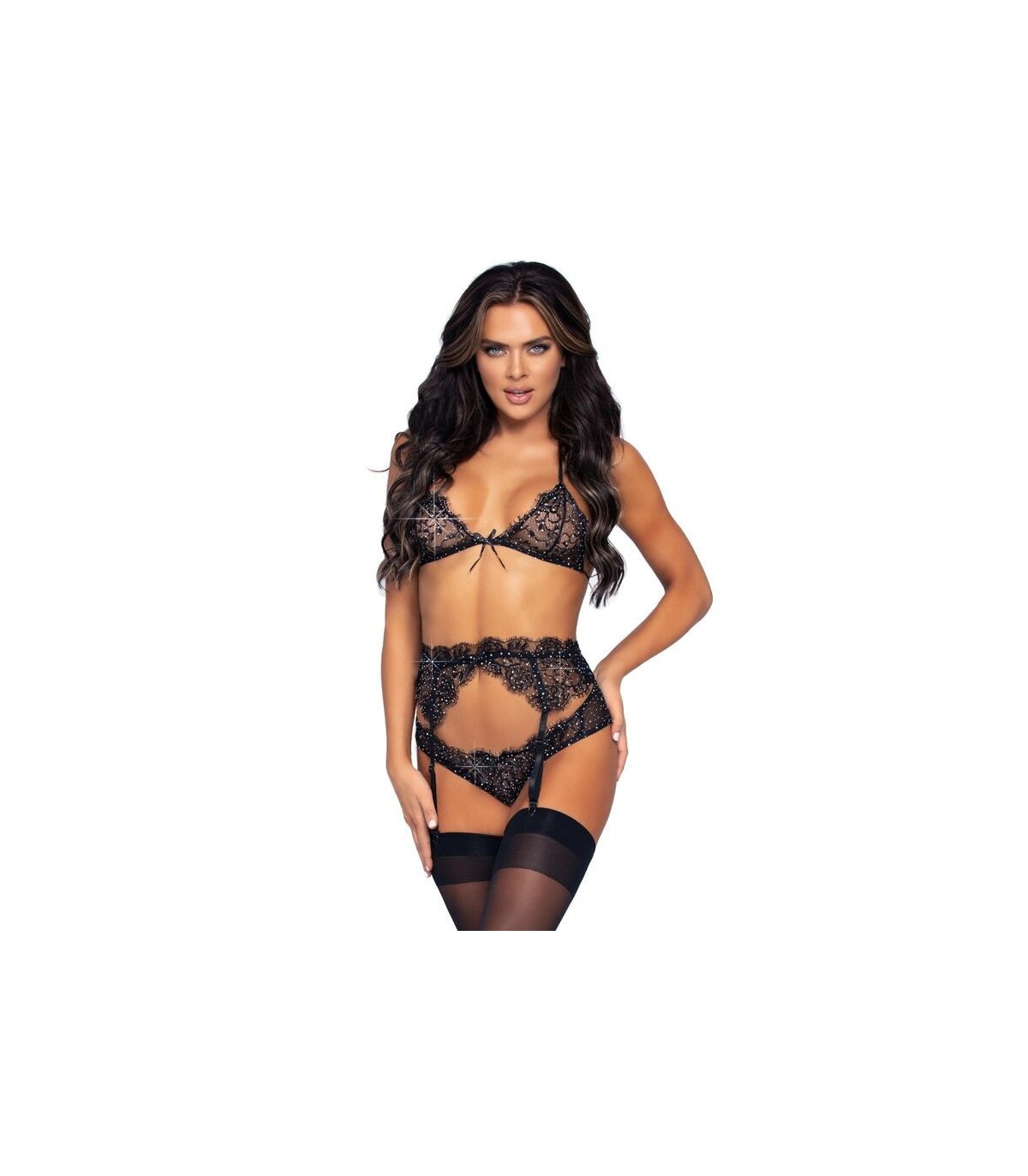 3 pzs. Conjunto de encaje con pestañas y mesh con strass, compuesto por una bralette, panty y liguero. Con Leg Avenue reforzarás tu feminidad y obtendrás ese toque justo de seducción, sensualidad y elegancia.